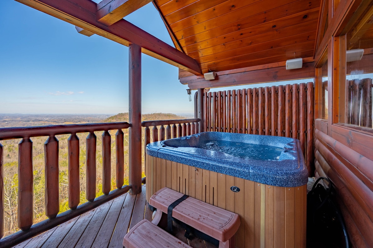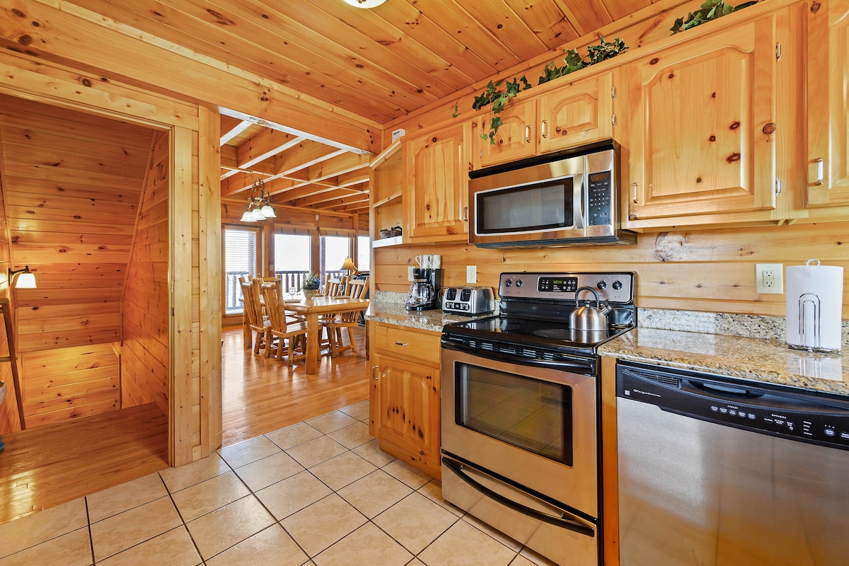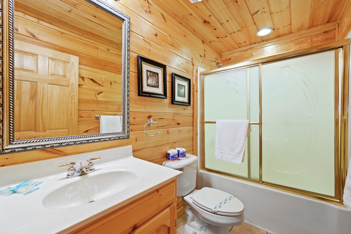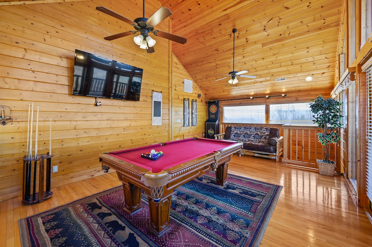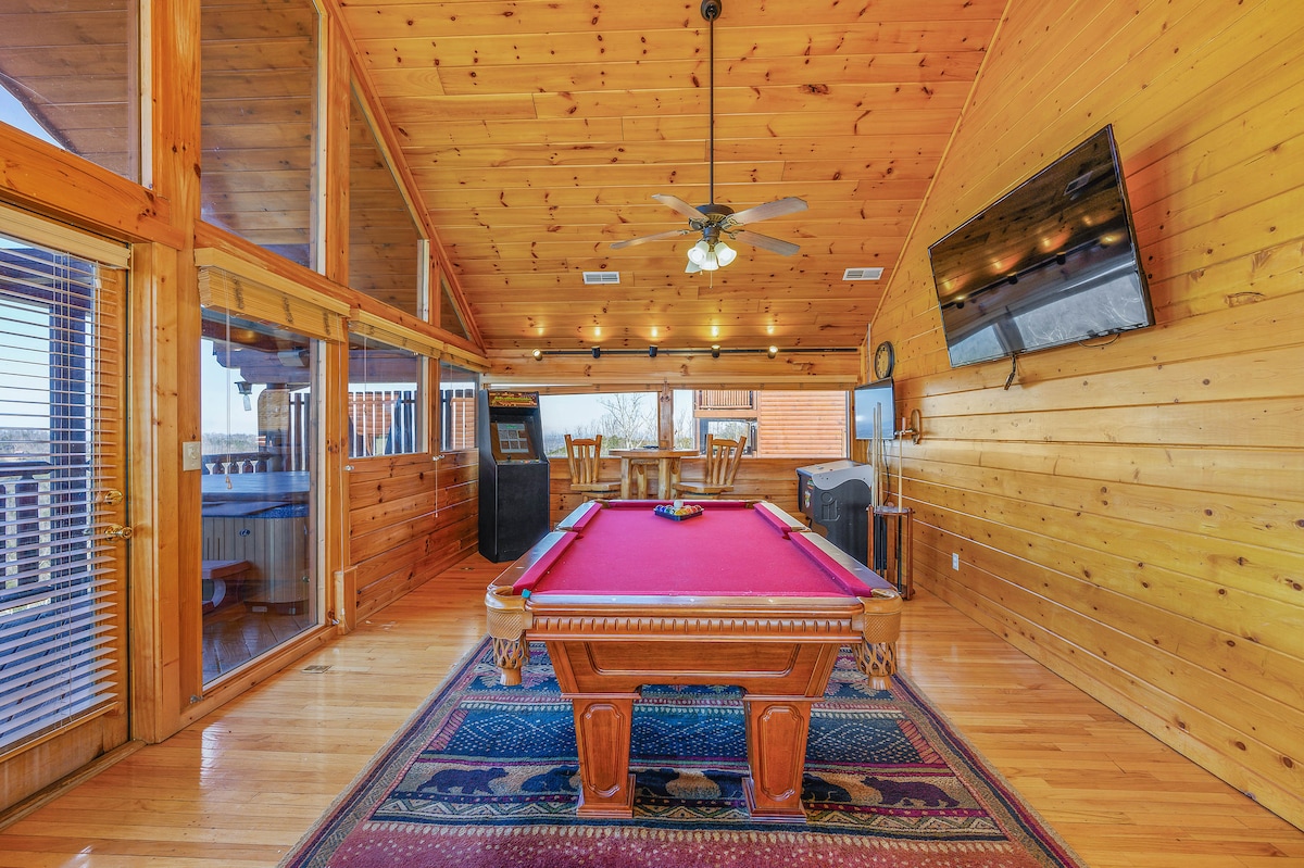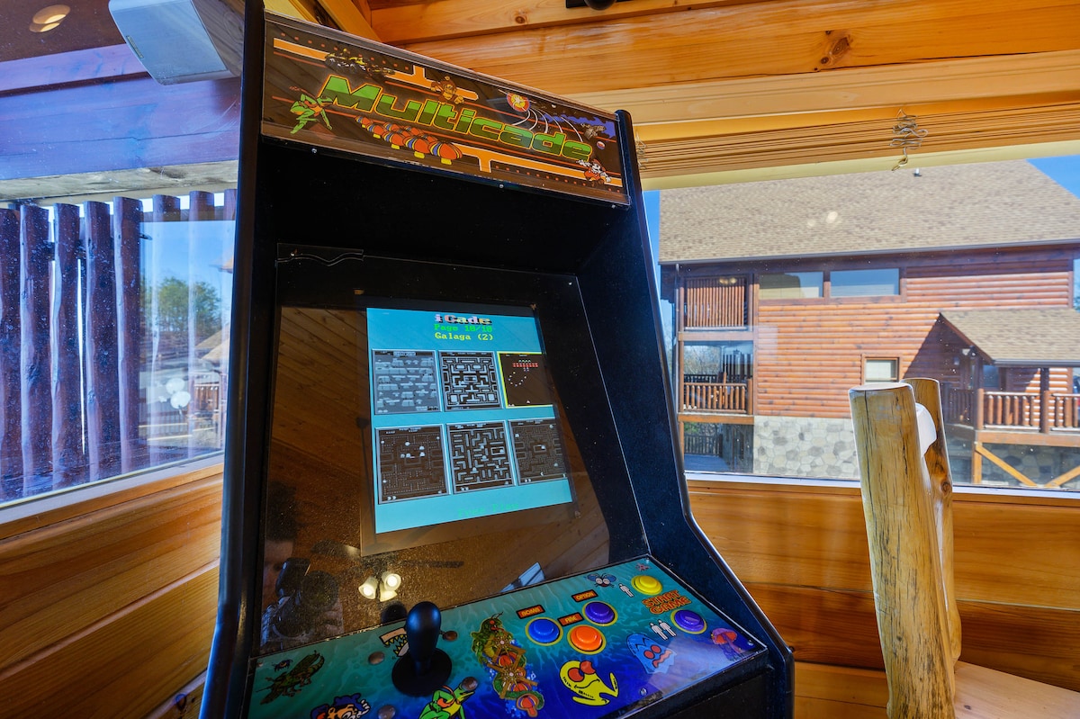 The spaceThe main level consists of the living area, well equipped kitchen with stainless steel appliances, dining area and one of the master bedrooms and bath. Downstairs you will find 2 additional master bedrooms each with private bath. The downstairs bedrooms are connected with a seating area with a desk for any work/school that may be required. The top floor is where you go to play. Power Putt golf arcade game lets everyone compete at Putt Putt golf without leaving the cabin. Also play on the pool table, 60 game retro arcade and darts. Futon in the loft provides extra sleeping for the kids or kids at heart. This floor also has the other master bedroom with a private fireplace and jacuzzi tub. Step out on the top deck and find the porch swing and hot tub looking over Pigeon Forge.