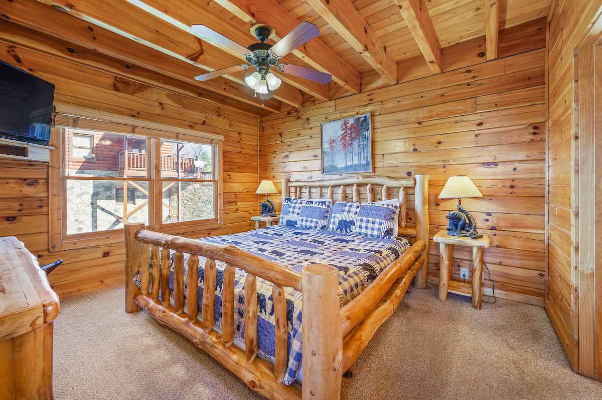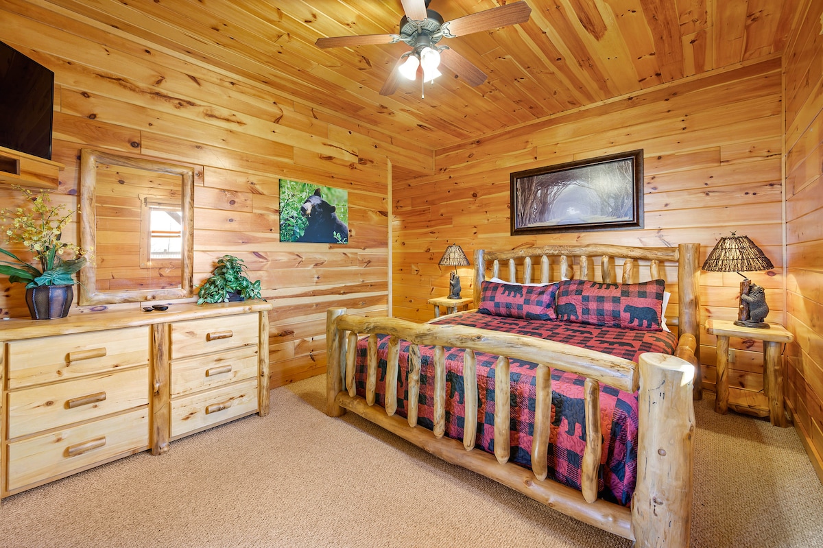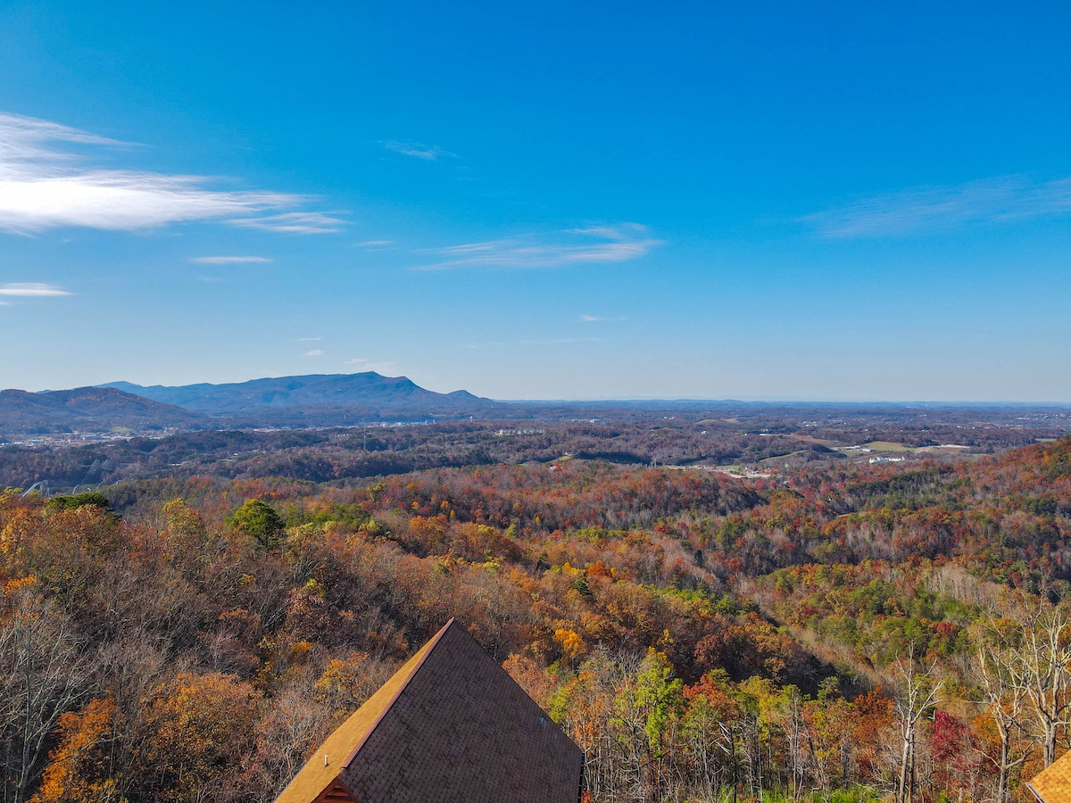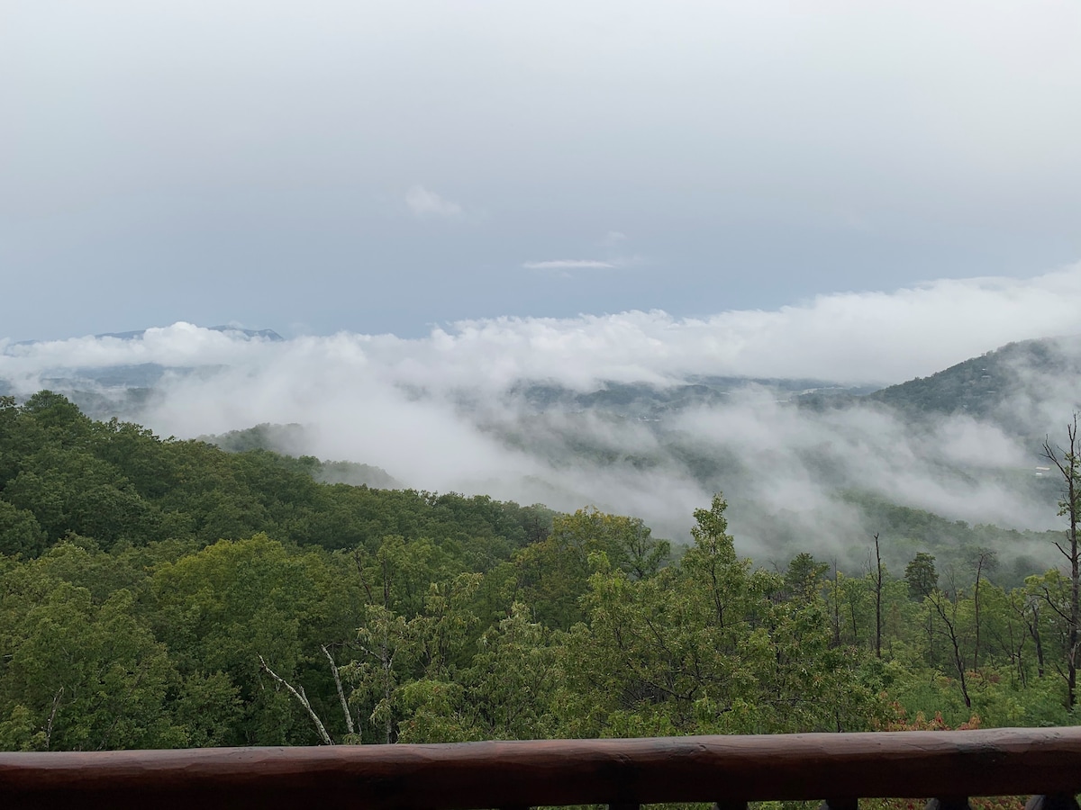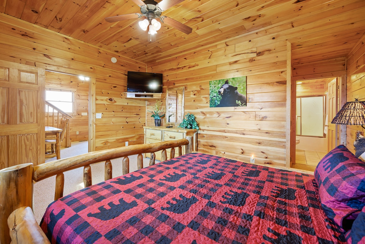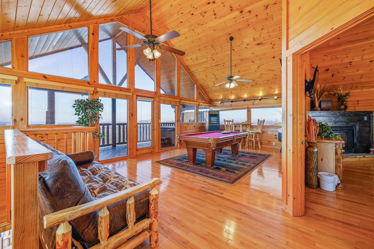 The spaceThe main level consists of the living area, well equipped kitchen with stainless steel appliances, dining area and one of the master bedrooms and bath. Downstairs you will find 2 additional master bedrooms each with private bath. The downstairs bedrooms are connected with a seating area with a desk for any work/school that may be required. The top floor is where you go to play. Power Putt golf arcade game lets everyone compete at Putt Putt golf without leaving the cabin. Also play on the pool table, 60 game retro arcade and darts. Futon in the loft provides extra sleeping for the kids or kids at heart. This floor also has the other master bedroom with a private fireplace and jacuzzi tub. Step out on the top deck and find the porch swing and hot tub looking over Pigeon Forge.