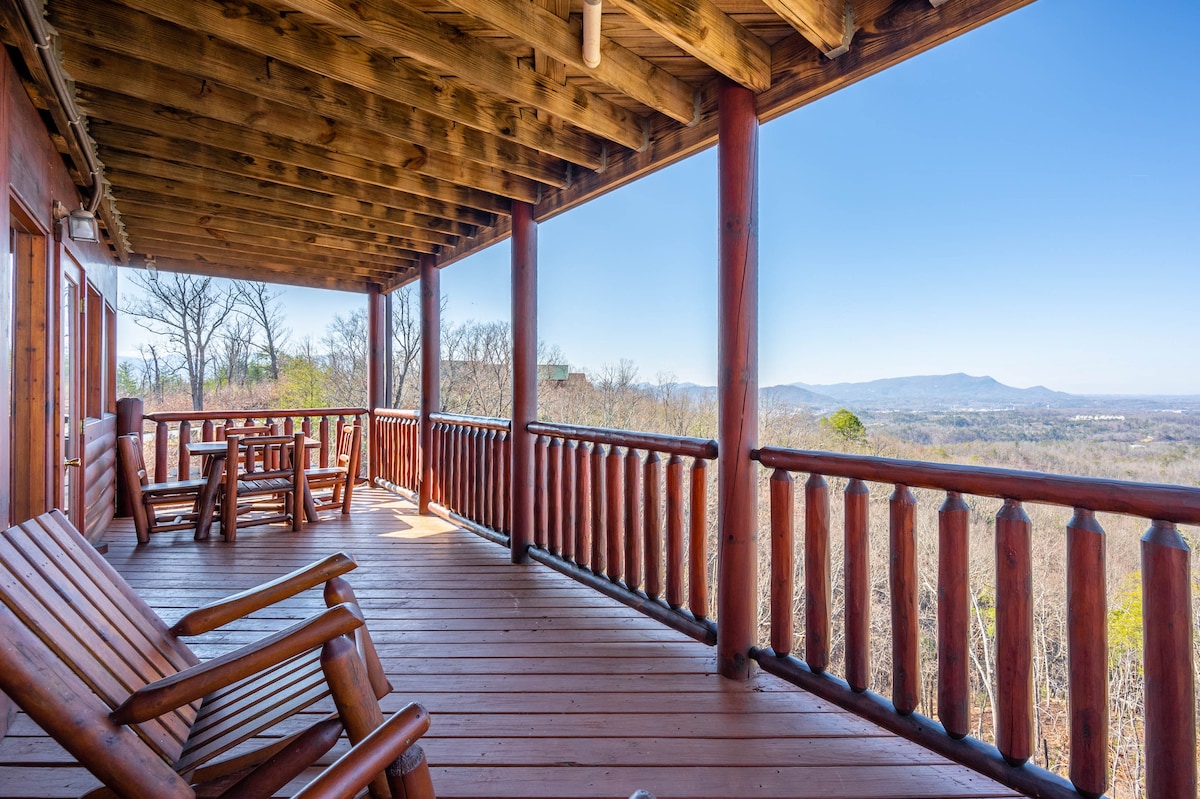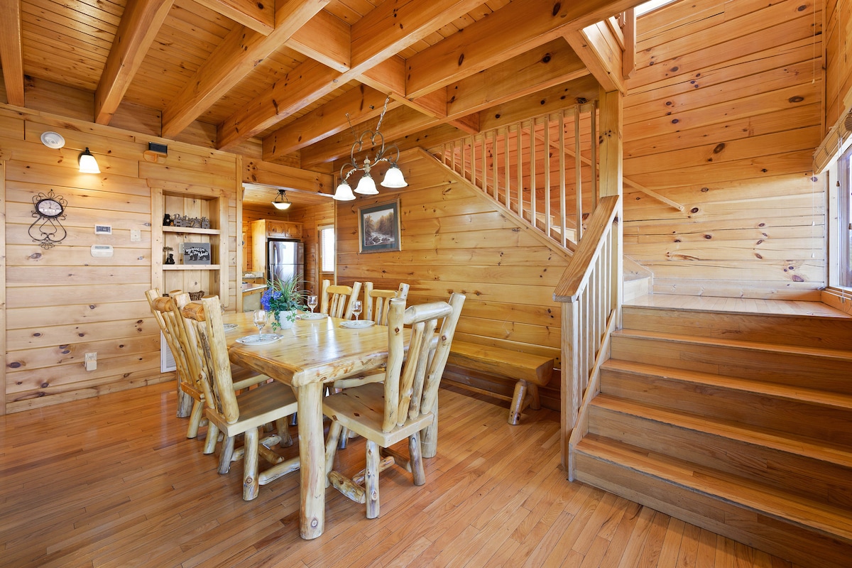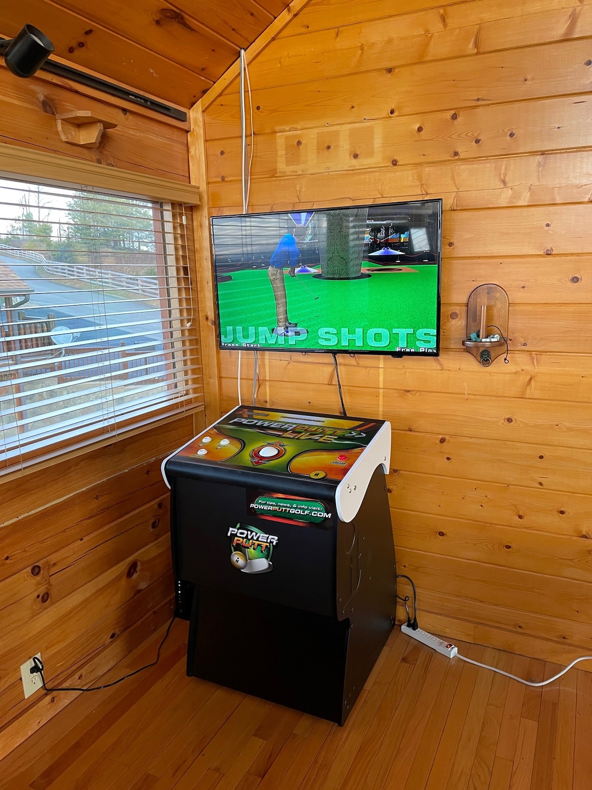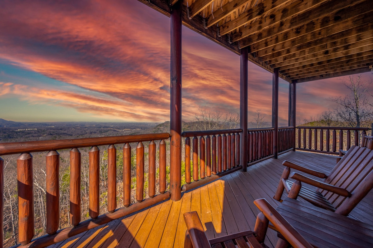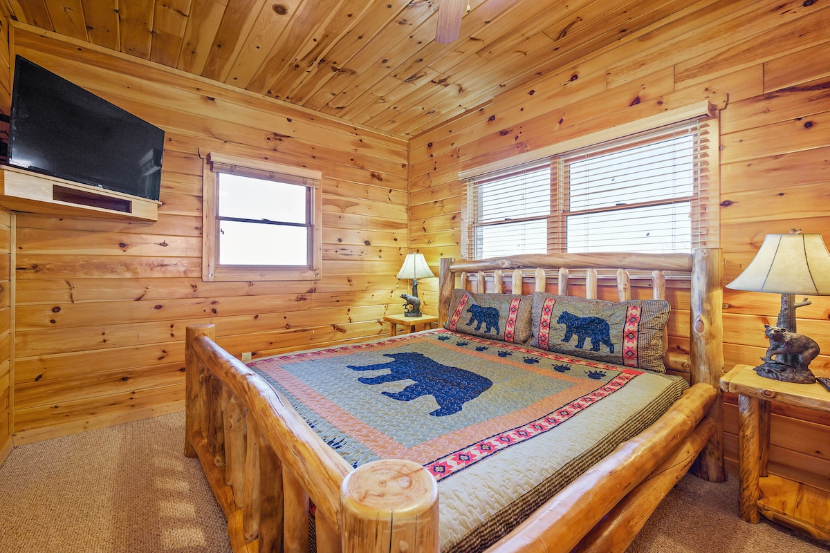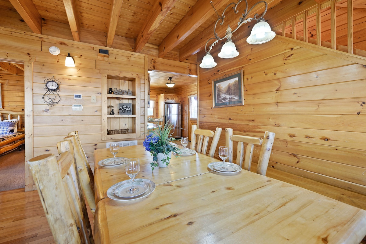 The spaceThe main level consists of the living area, well equipped kitchen with stainless steel appliances, dining area and one of the master bedrooms and bath. Downstairs you will find 2 additional master bedrooms each with private bath. The downstairs bedrooms are connected with a seating area with a desk for any work/school that may be required. The top floor is where you go to play. Power Putt golf arcade game lets everyone compete at Putt Putt golf without leaving the cabin. Also play on the pool table, 60 game retro arcade and darts. Futon in the loft provides extra sleeping for the kids or kids at heart. This floor also has the other master bedroom with a private fireplace and jacuzzi tub. Step out on the top deck and find the porch swing and hot tub looking over Pigeon Forge.