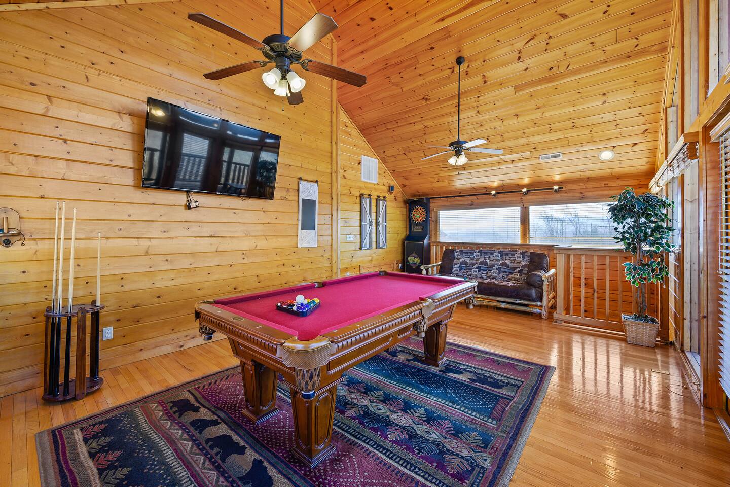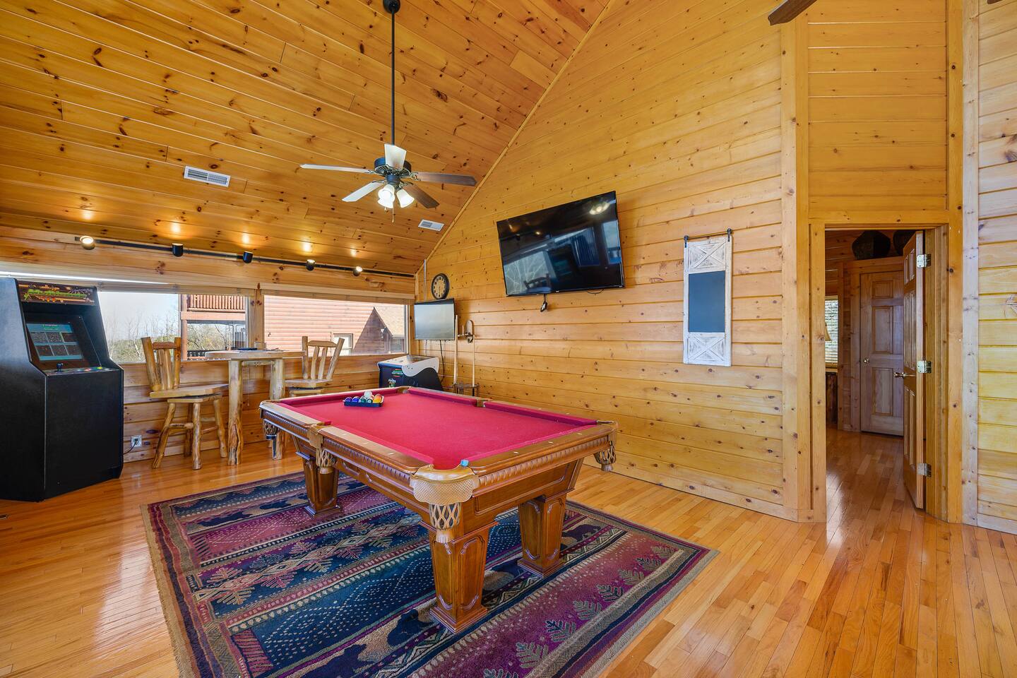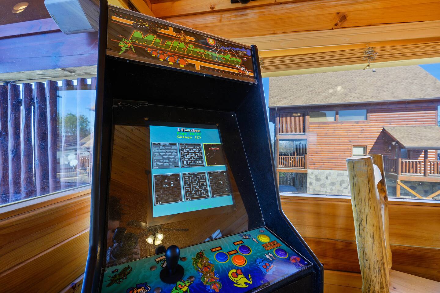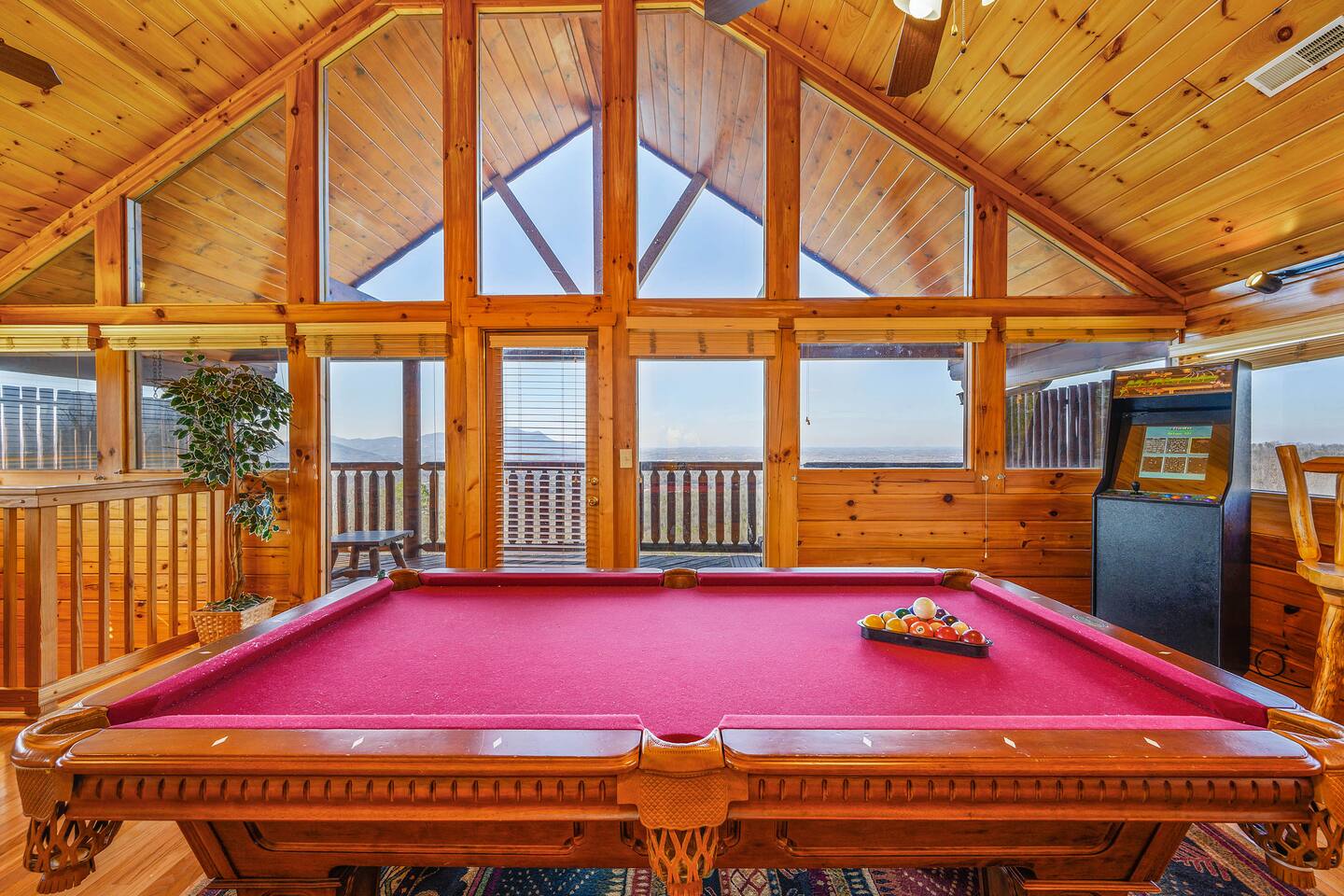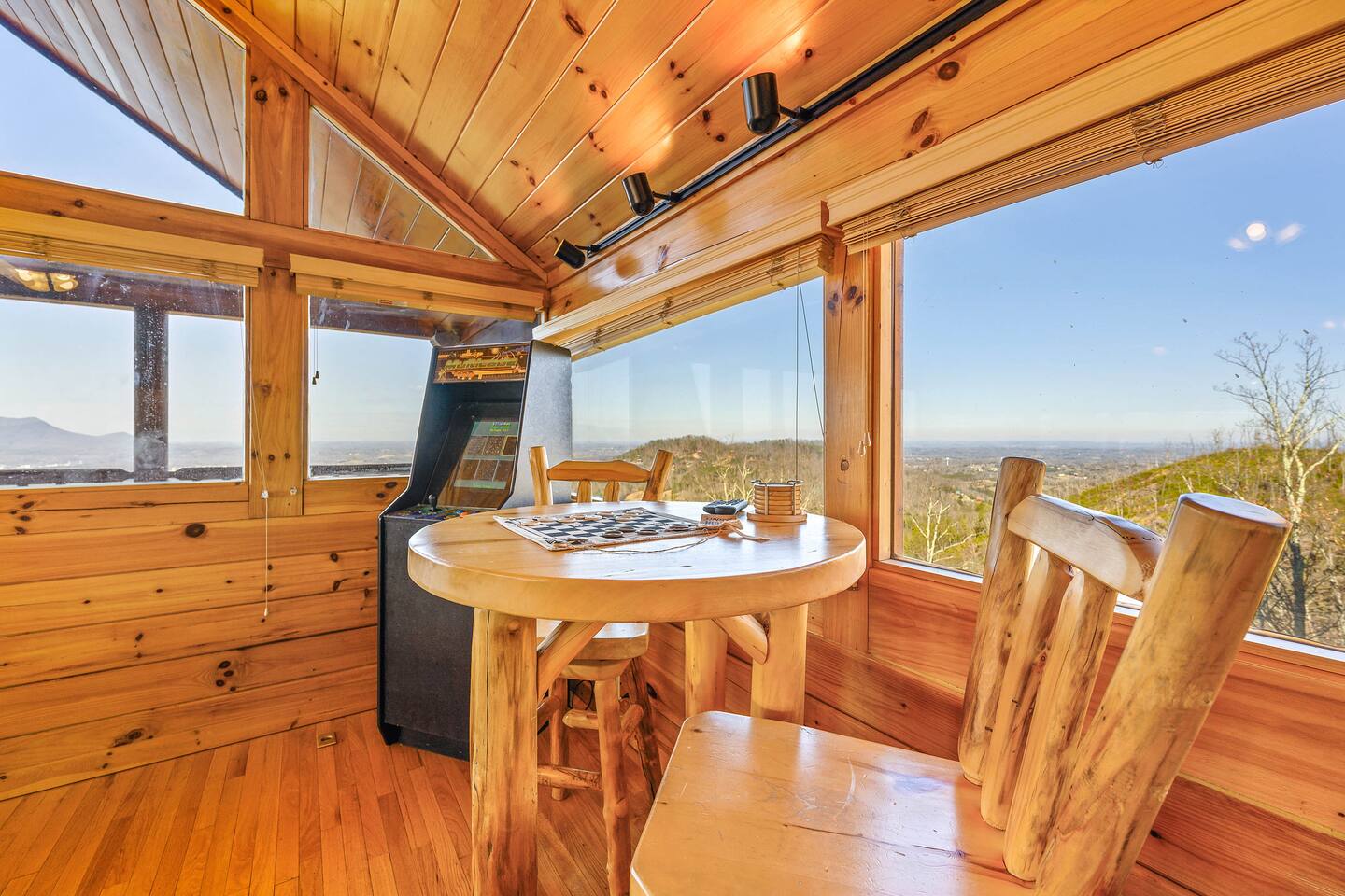 The main level consists of the living area, well equipped kitchen with stainless steel appliances, dining area and one of the master bedrooms and bath. Downstairs you will find 2 additional master bedrooms each with private bath. The downstairs bedrooms are connected with a seating area with a desk for any work/school that may be required. The top floor is where you go to play. Power Putt golf arcade game lets everyone compete at Putt Putt golf without leaving the cabin. Also play on the pool table, 60 game retro arcade and darts. Futon in the loft provides extra sleeping for the kids or kids at heart. This floor also has the other master bedroom with a private fireplace and jacuzzi tub. Step out on the top deck and find the porch swing and hot tub looking over Pigeon Forge. The resort has easy to navigate roads, a pool (during summer season), playground and a picnic area. This cabin also has: *Breathtaking views *Parking for 4 cars *6 Smart TVs *Blazing fast WiFi *Quality linens *Washer/Dryer *Charcoal Grill.