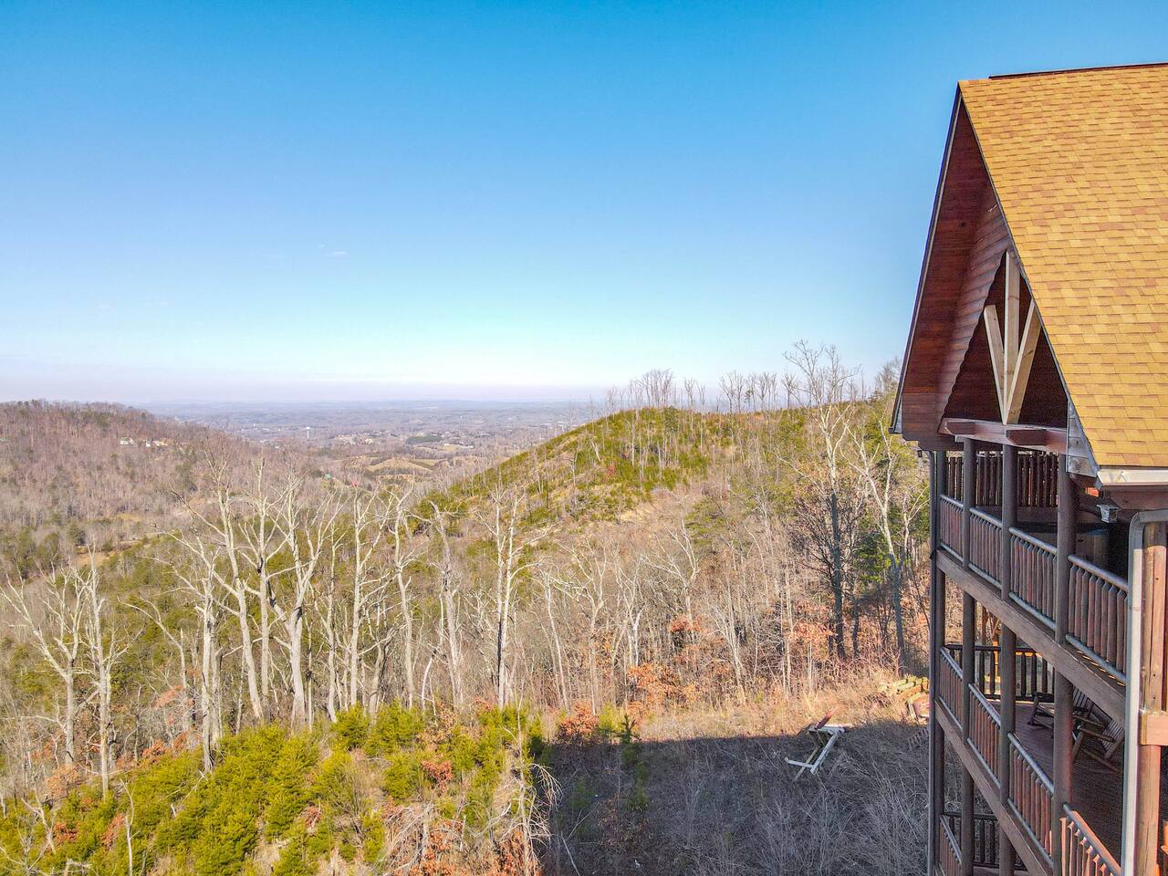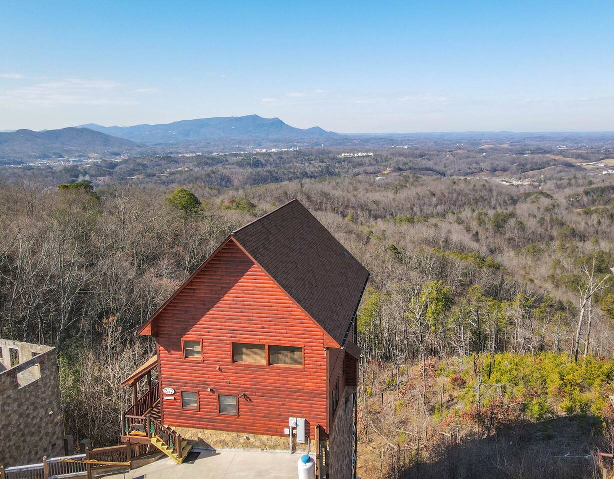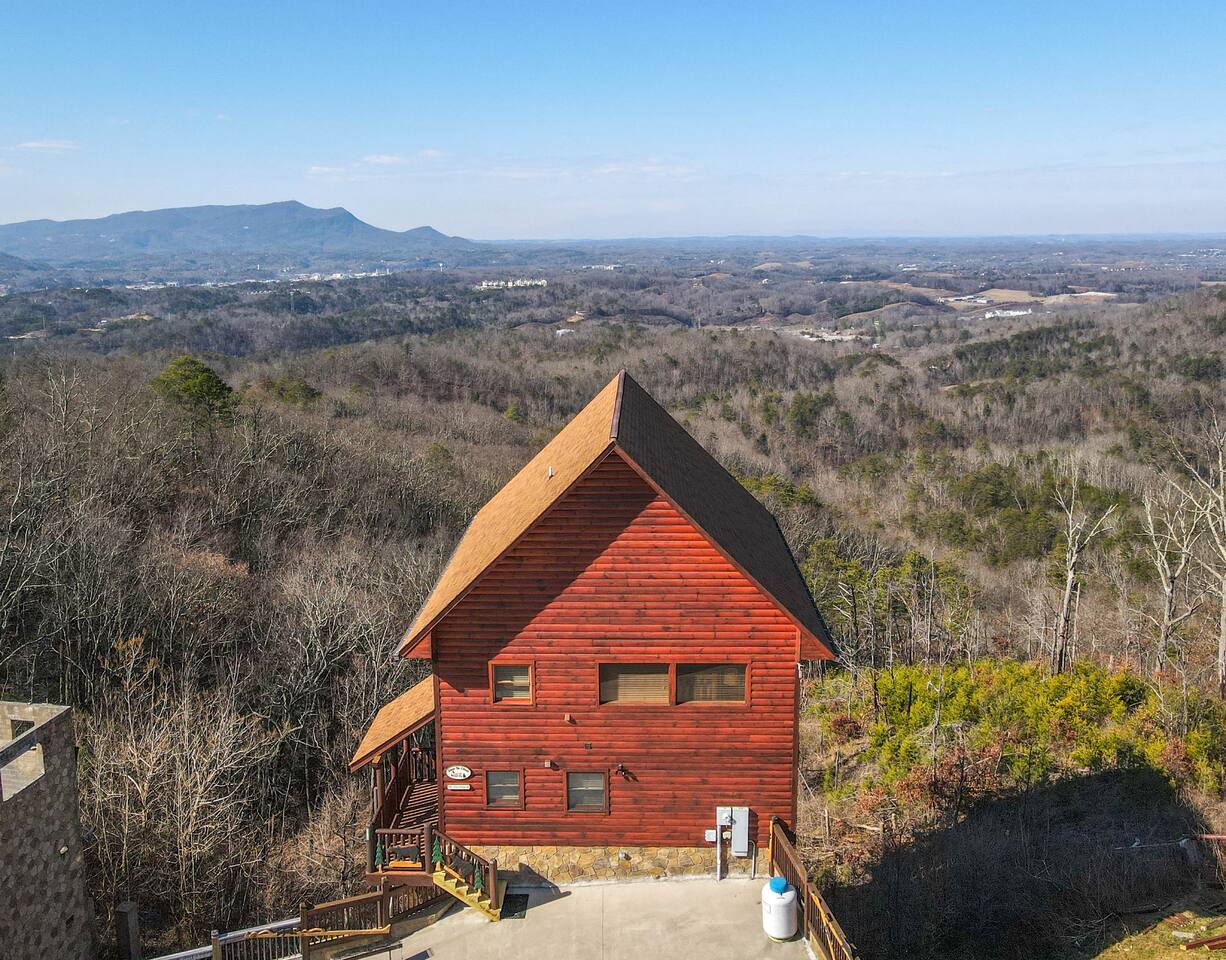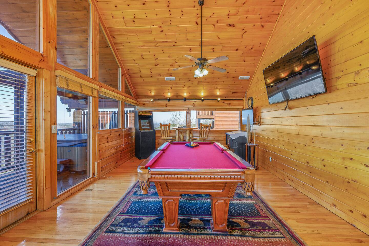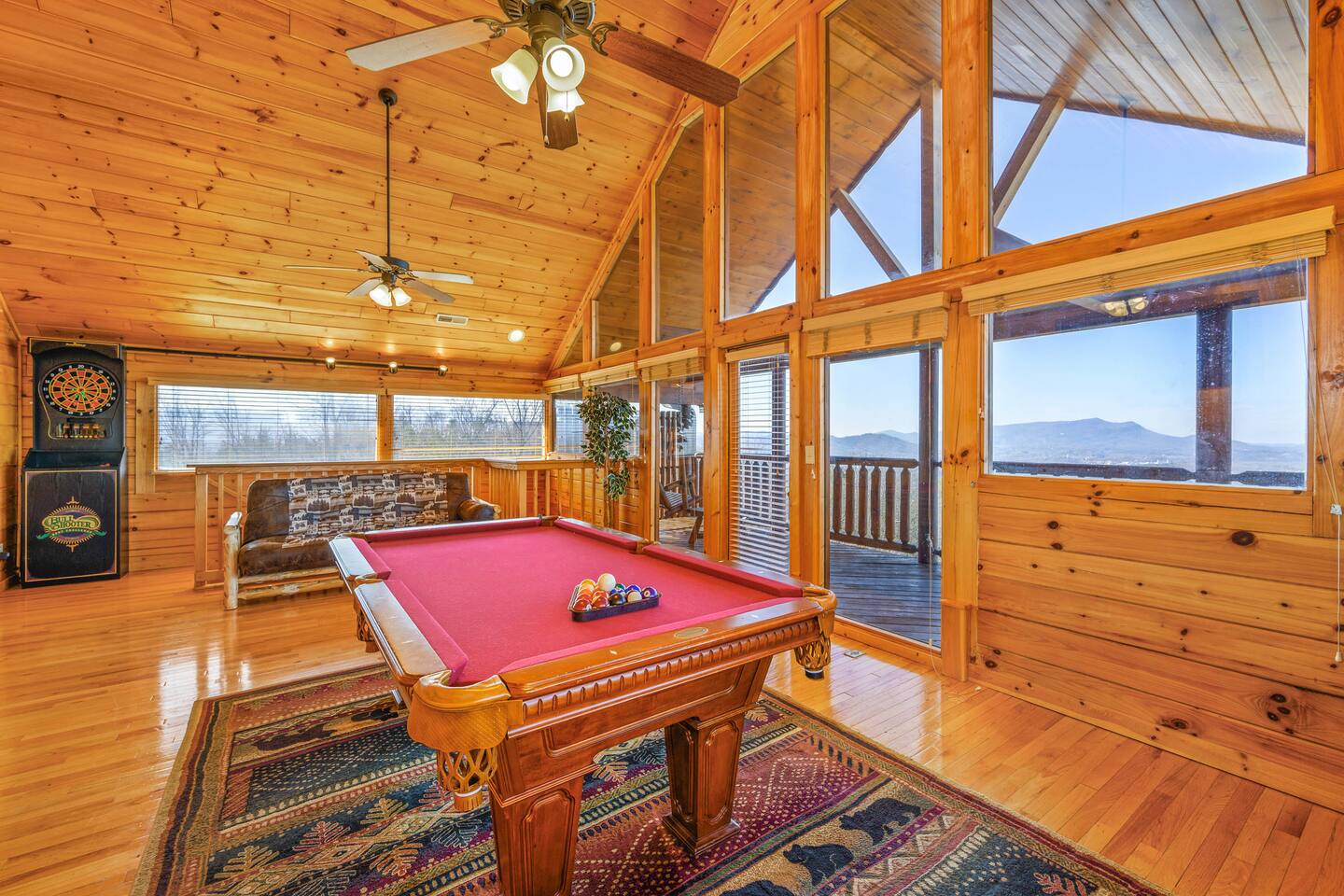 The main level consists of the living area, well equipped kitchen with stainless steel appliances, dining area and one of the master bedrooms and bath. Downstairs you will find 2 additional master bedrooms each with private bath. The downstairs bedrooms are connected with a seating area with a desk for any work/school that may be required. The top floor is where you go to play. Power Putt golf arcade game lets everyone compete at Putt Putt golf without leaving the cabin. Also play on the pool table, 60 game retro arcade and darts. Futon in the loft provides extra sleeping for the kids or kids at heart. This floor also has the other master bedroom with a private fireplace and jacuzzi tub. Step out on the top deck and find the porch swing and hot tub looking over Pigeon Forge. The resort has easy to navigate roads, a pool (during summer season), playground and a picnic area. This cabin also has: *Breathtaking views *Parking for 4 cars *6 Smart TVs *Blazing fast WiFi *Quality linens *Washer/Dryer *Charcoal Grill.