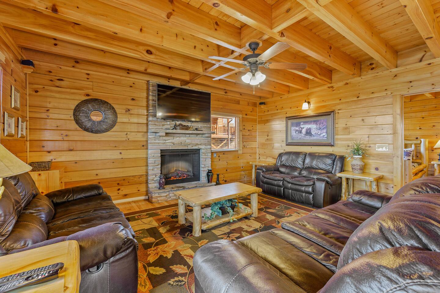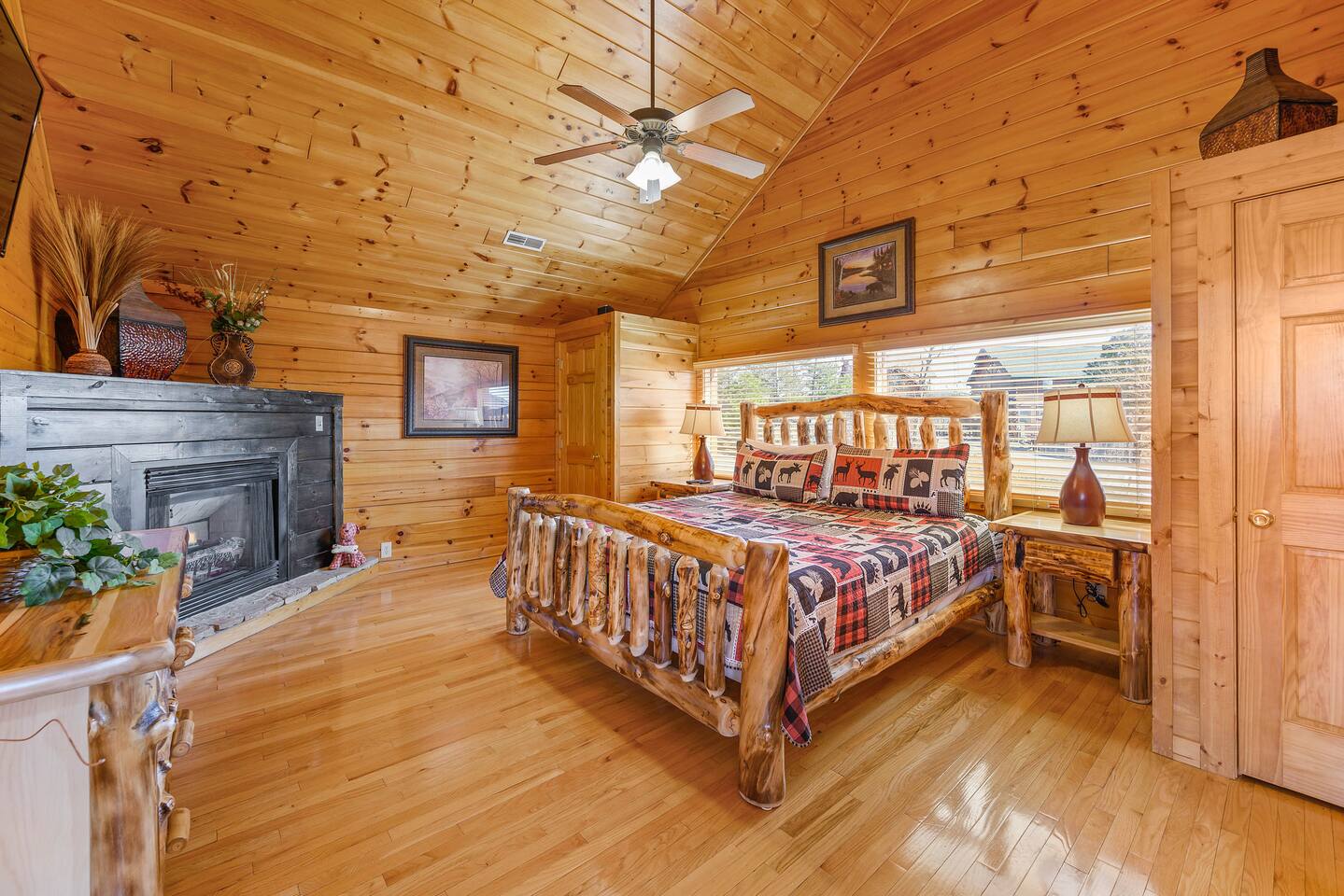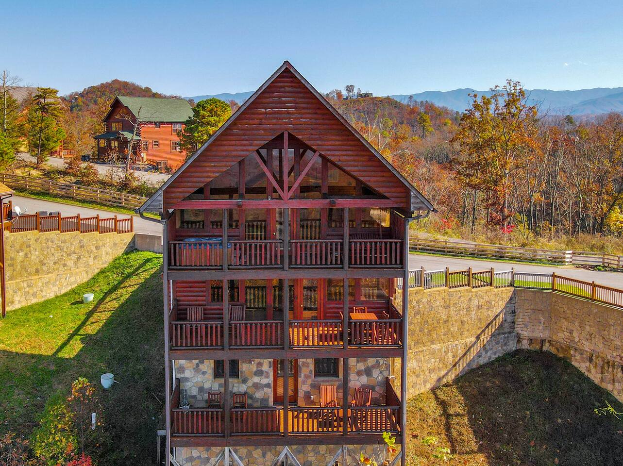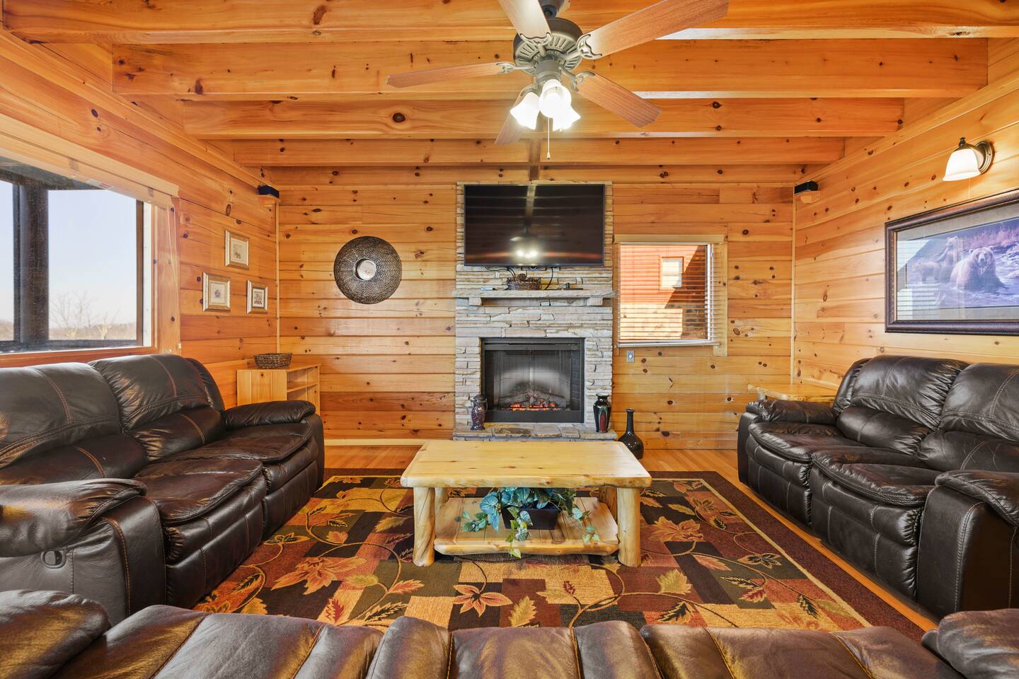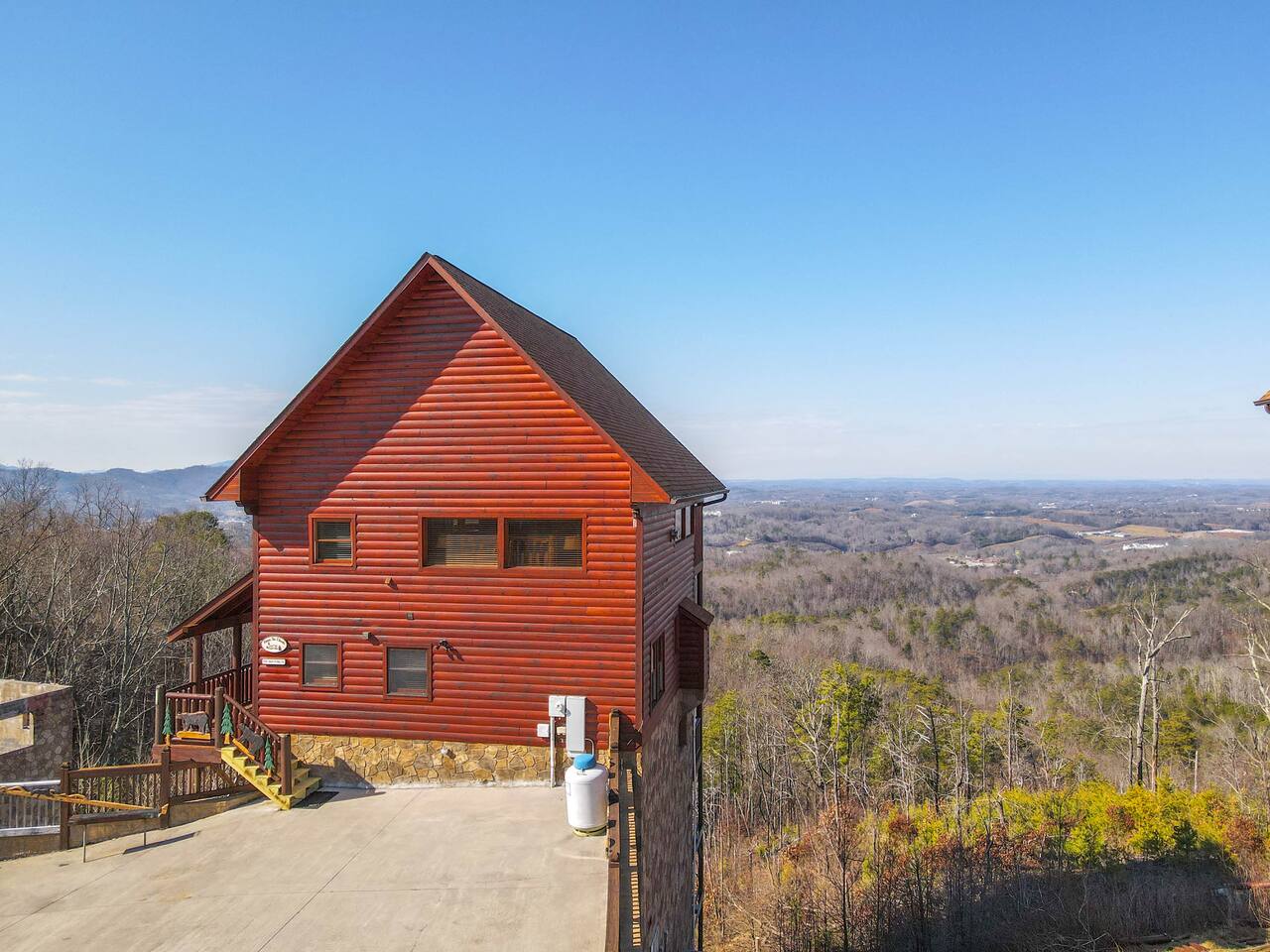 The main level consists of the living area, well equipped kitchen with stainless steel appliances, dining area and one of the master bedrooms and bath. Downstairs you will find 2 additional master bedrooms each with private bath. The downstairs bedrooms are connected with a seating area with a desk for any work/school that may be required. The top floor is where you go to play. Power Putt golf arcade game lets everyone compete at Putt Putt golf without leaving the cabin. Also play on the pool table, 60 game retro arcade and darts. Futon in the loft provides extra sleeping for the kids or kids at heart. This floor also has the other master bedroom with a private fireplace and jacuzzi tub. Step out on the top deck and find the porch swing and hot tub looking over Pigeon Forge. The resort has easy to navigate roads, a pool (during summer season), playground and a picnic area. This cabin also has: *Breathtaking views *Parking for 4 cars *6 Smart TVs *Blazing fast WiFi *Quality linens *Washer/Dryer *Charcoal Grill.