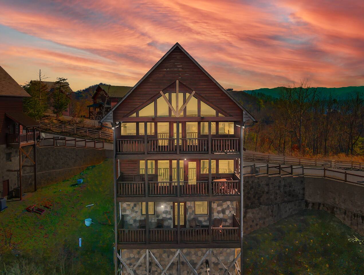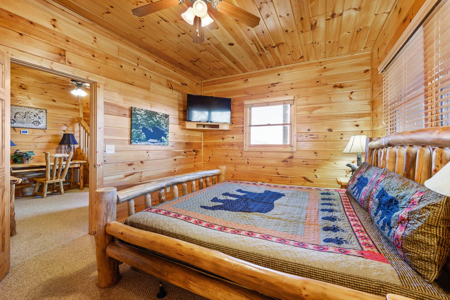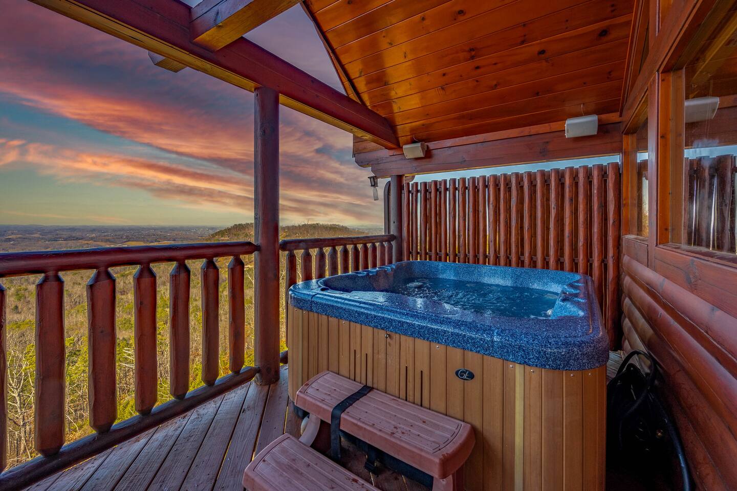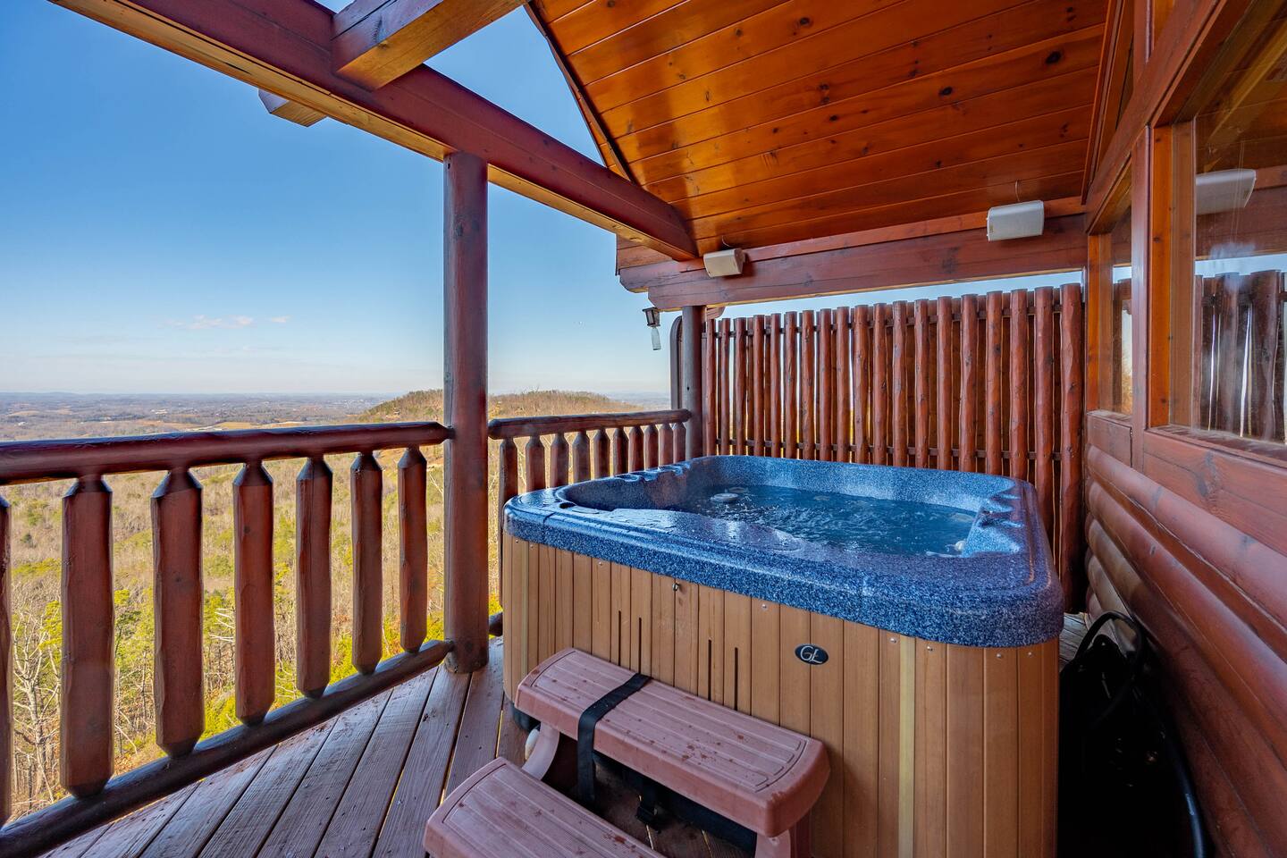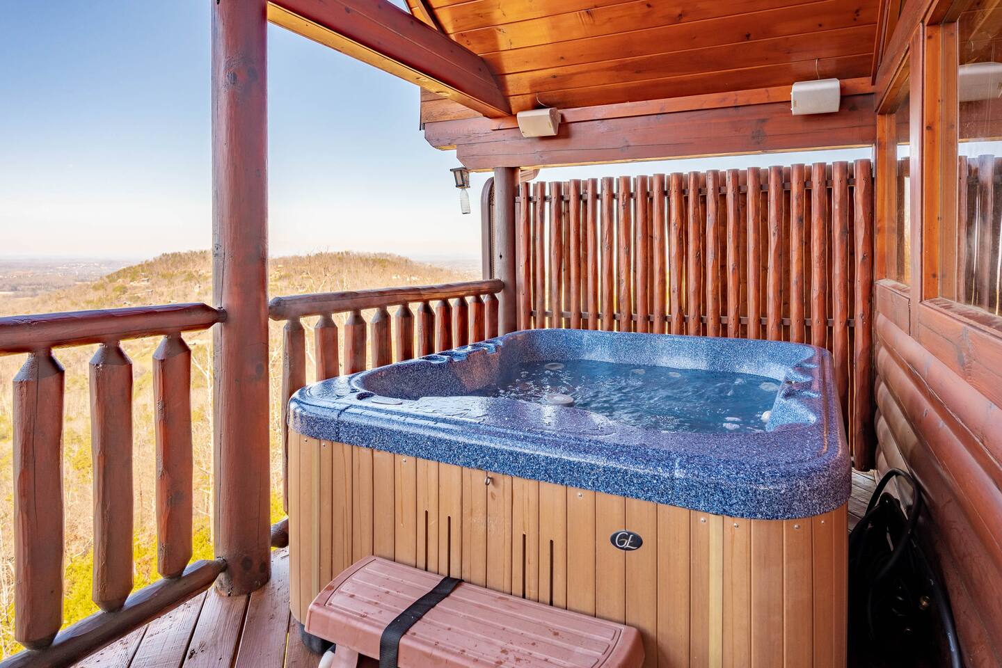 The main level consists of the living area, well equipped kitchen with stainless steel appliances, dining area and one of the master bedrooms and bath. Downstairs you will find 2 additional master bedrooms each with private bath. The downstairs bedrooms are connected with a seating area with a desk for any work/school that may be required. The top floor is where you go to play. Power Putt golf arcade game lets everyone compete at Putt Putt golf without leaving the cabin. Also play on the pool table, 60 game retro arcade and darts. Futon in the loft provides extra sleeping for the kids or kids at heart. This floor also has the other master bedroom with a private fireplace and jacuzzi tub. Step out on the top deck and find the porch swing and hot tub looking over Pigeon Forge. The resort has easy to navigate roads, a pool (during summer season), playground and a picnic area. This cabin also has: *Breathtaking views *Parking for 4 cars *6 Smart TVs *Blazing fast WiFi *Quality linens *Washer/Dryer *Charcoal Grill.