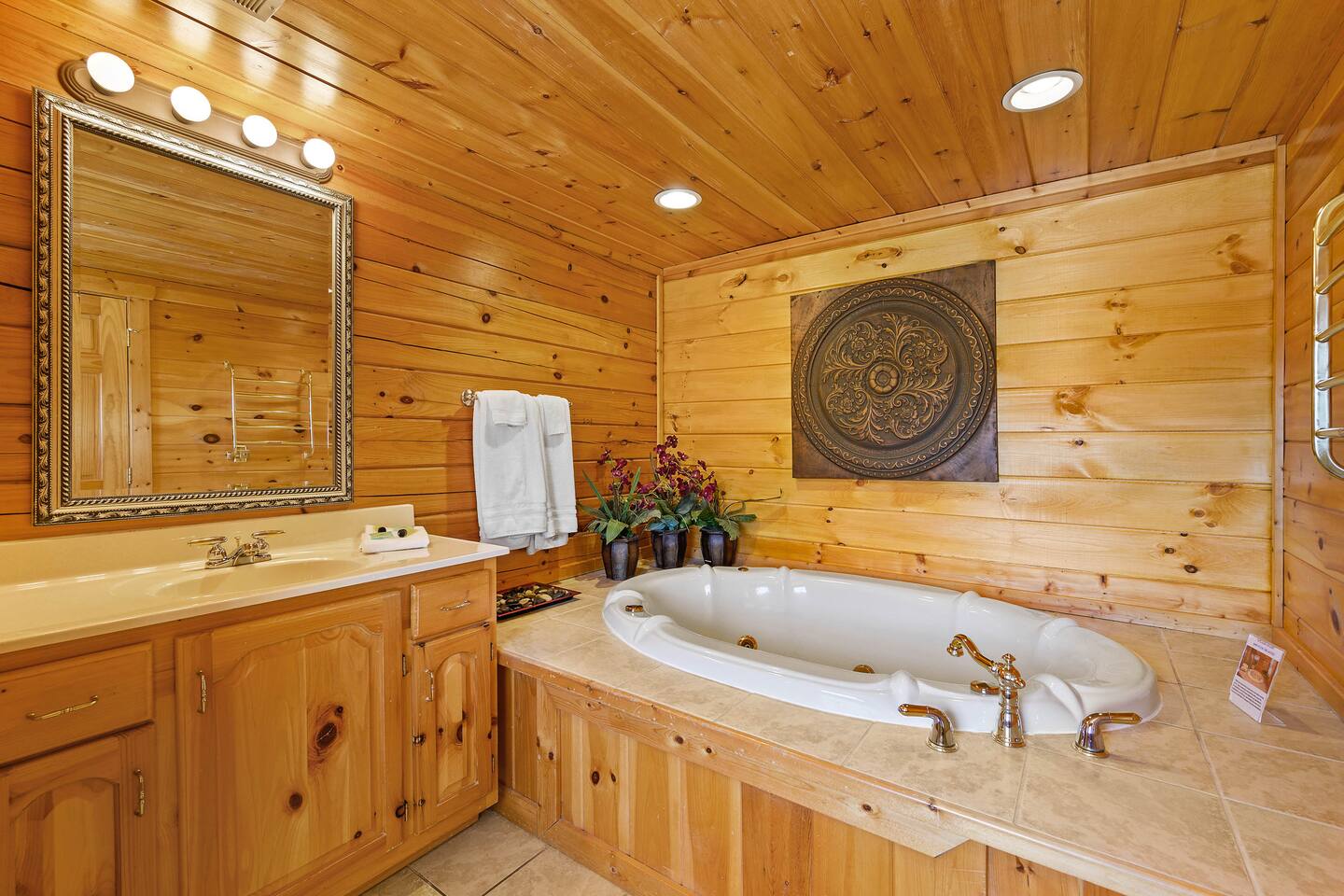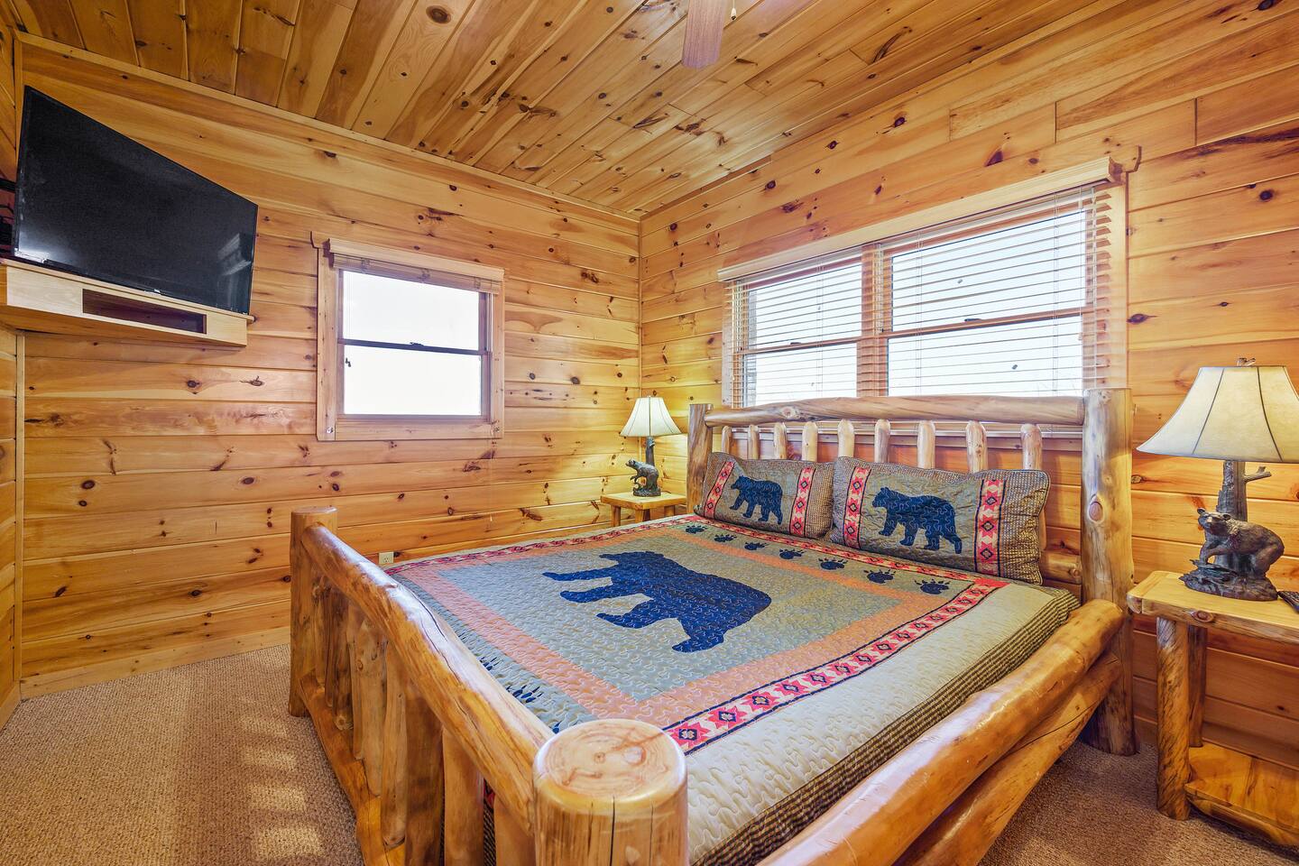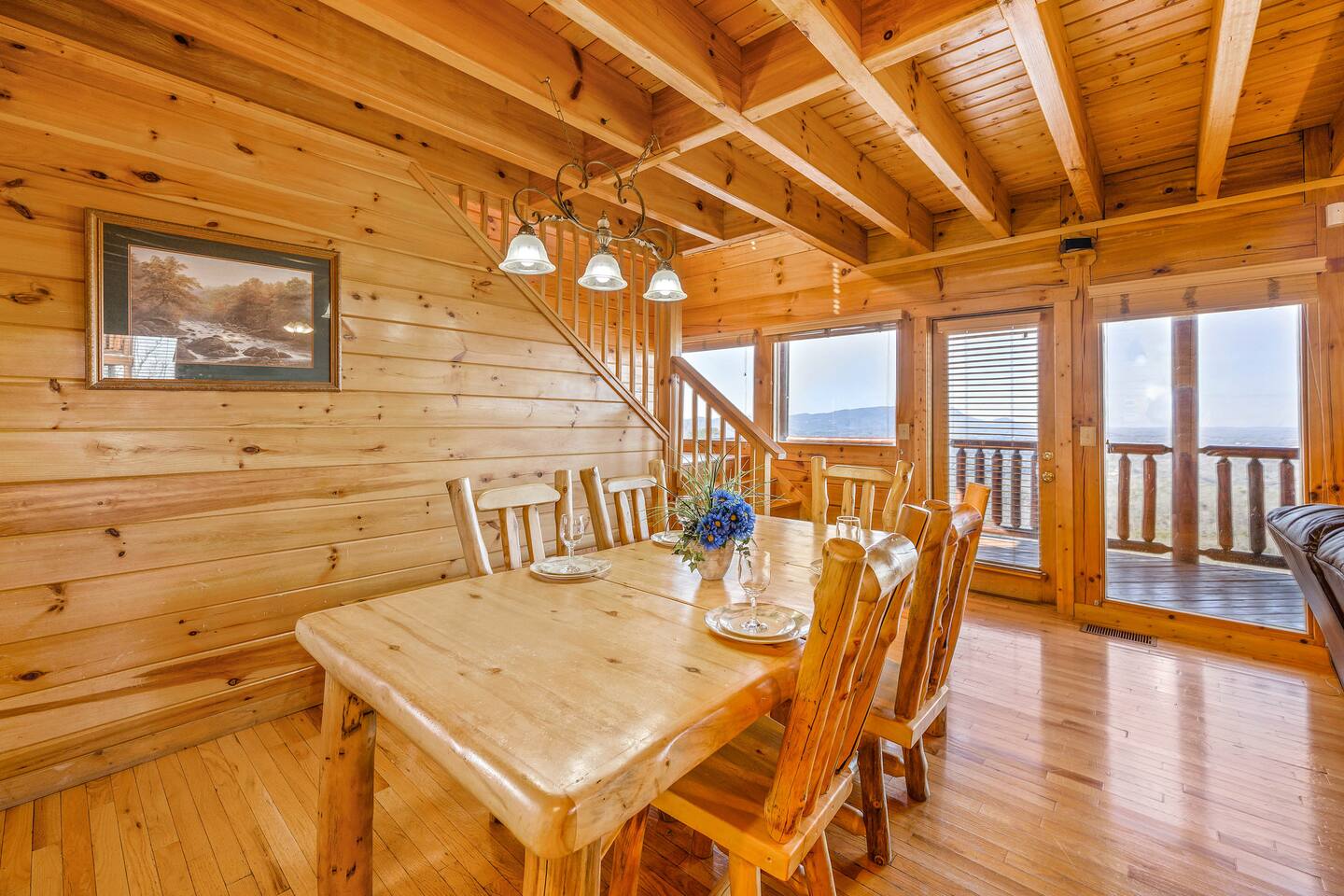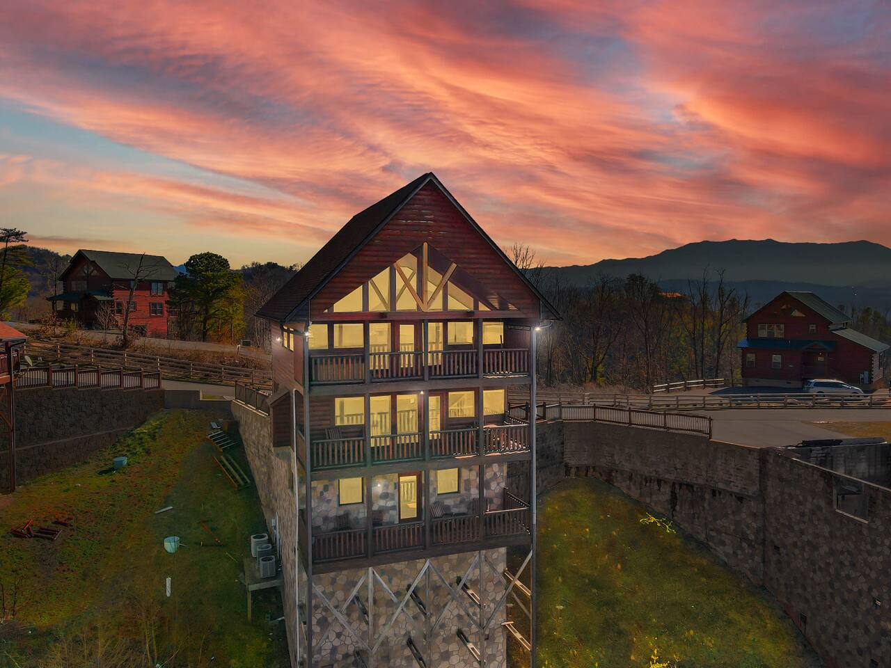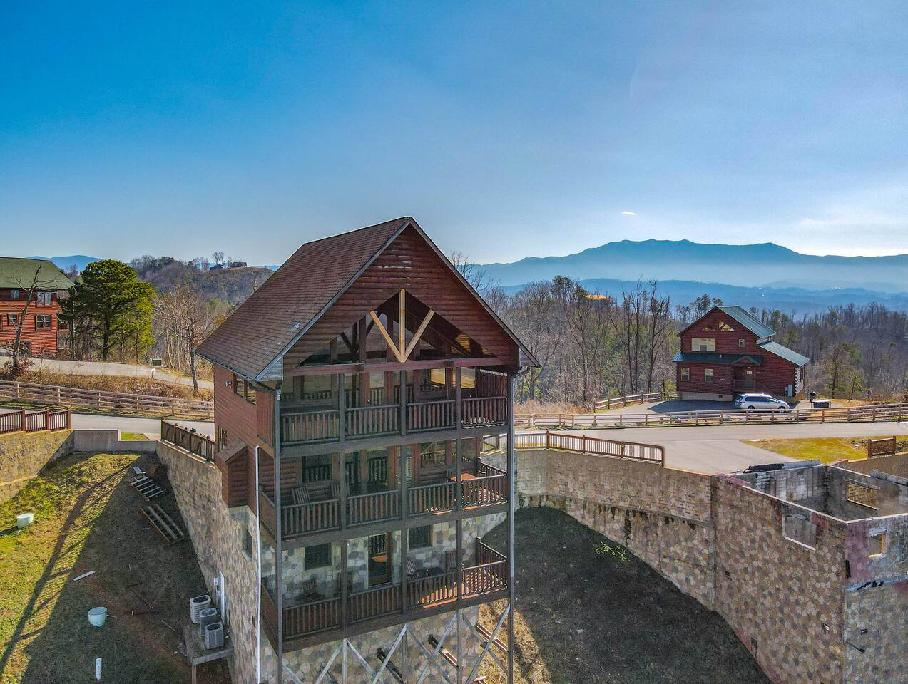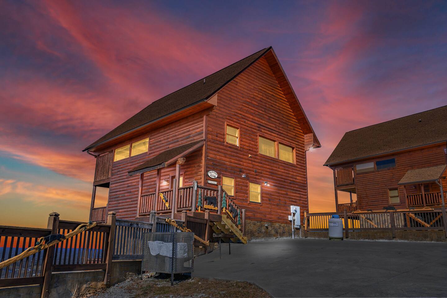 The main level consists of the living area, well equipped kitchen with stainless steel appliances, dining area and one of the master bedrooms and bath. Downstairs you will find 2 additional master bedrooms each with private bath. The downstairs bedrooms are connected with a seating area with a desk for any work/school that may be required. The top floor is where you go to play. Power Putt golf arcade game lets everyone compete at Putt Putt golf without leaving the cabin. Also play on the pool table, 60 game retro arcade and darts. Futon in the loft provides extra sleeping for the kids or kids at heart. This floor also has the other master bedroom with a private fireplace and jacuzzi tub. Step out on the top deck and find the porch swing and hot tub looking over Pigeon Forge. The resort has easy to navigate roads, a pool (during summer season), playground and a picnic area. This cabin also has: *Breathtaking views *Parking for 4 cars *6 Smart TVs *Blazing fast WiFi *Quality linens *Washer/Dryer *Charcoal Grill.
