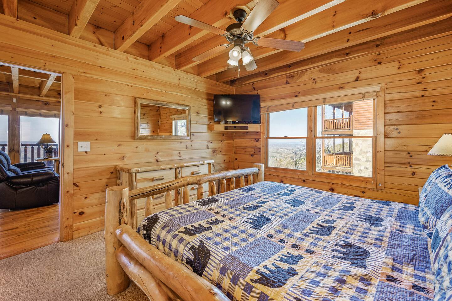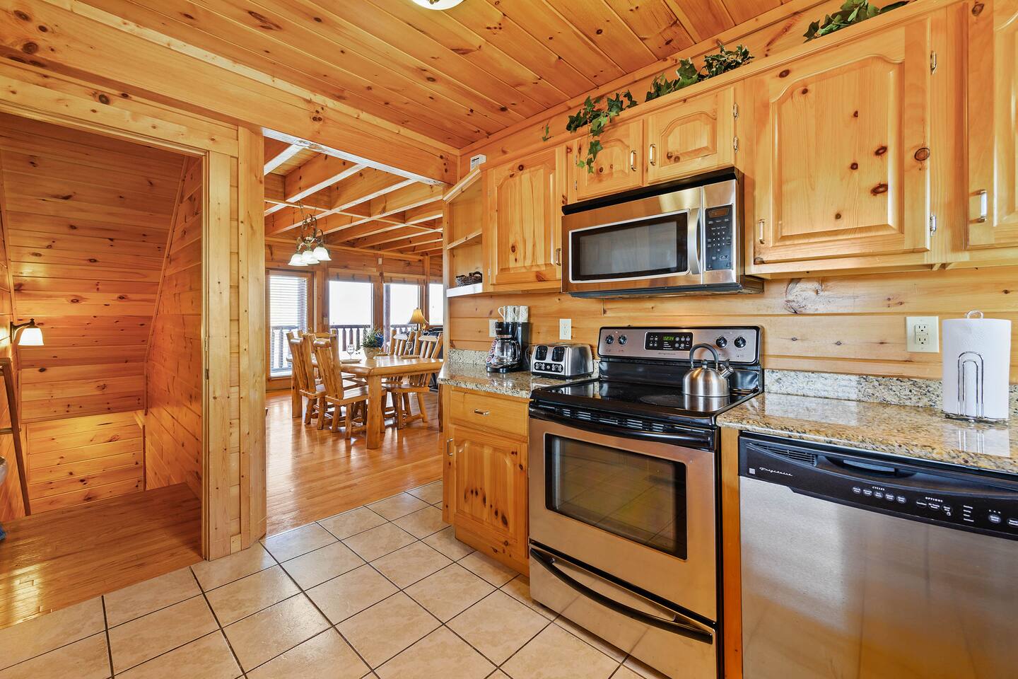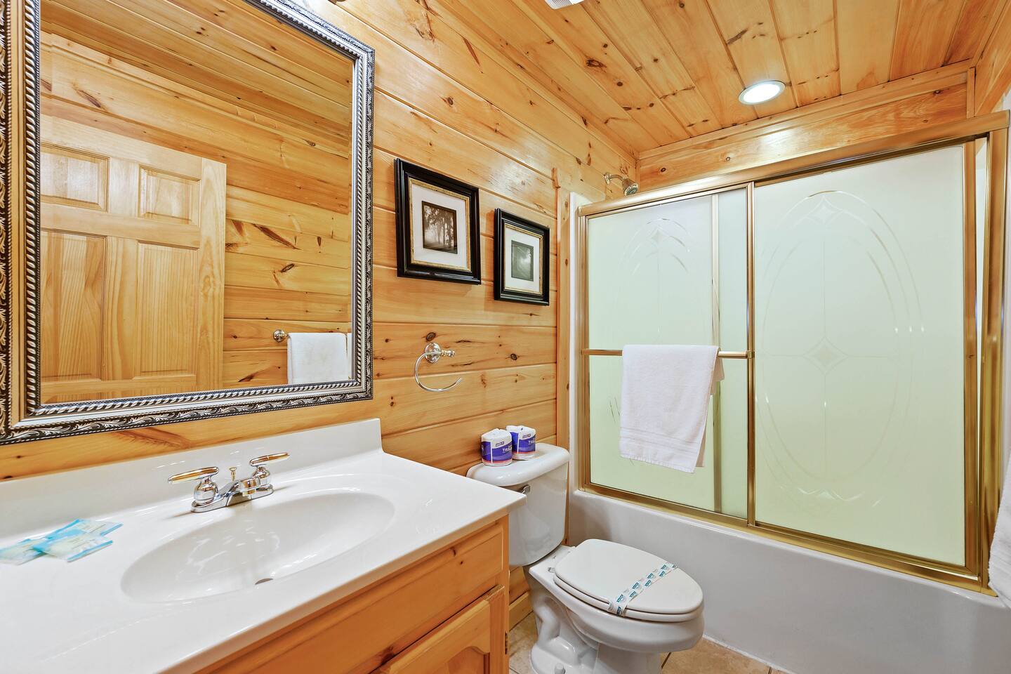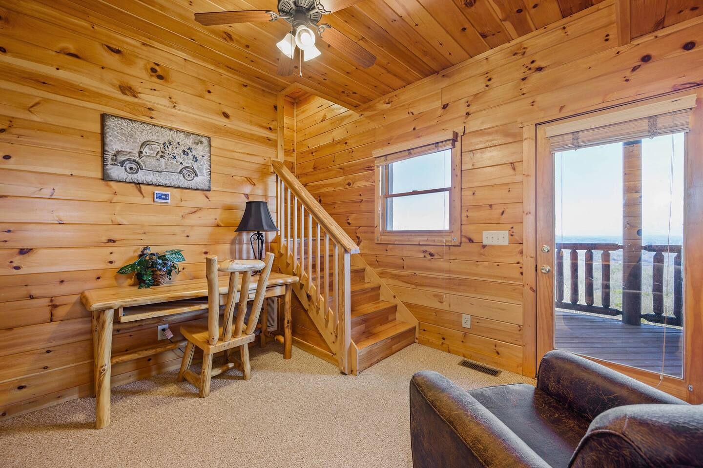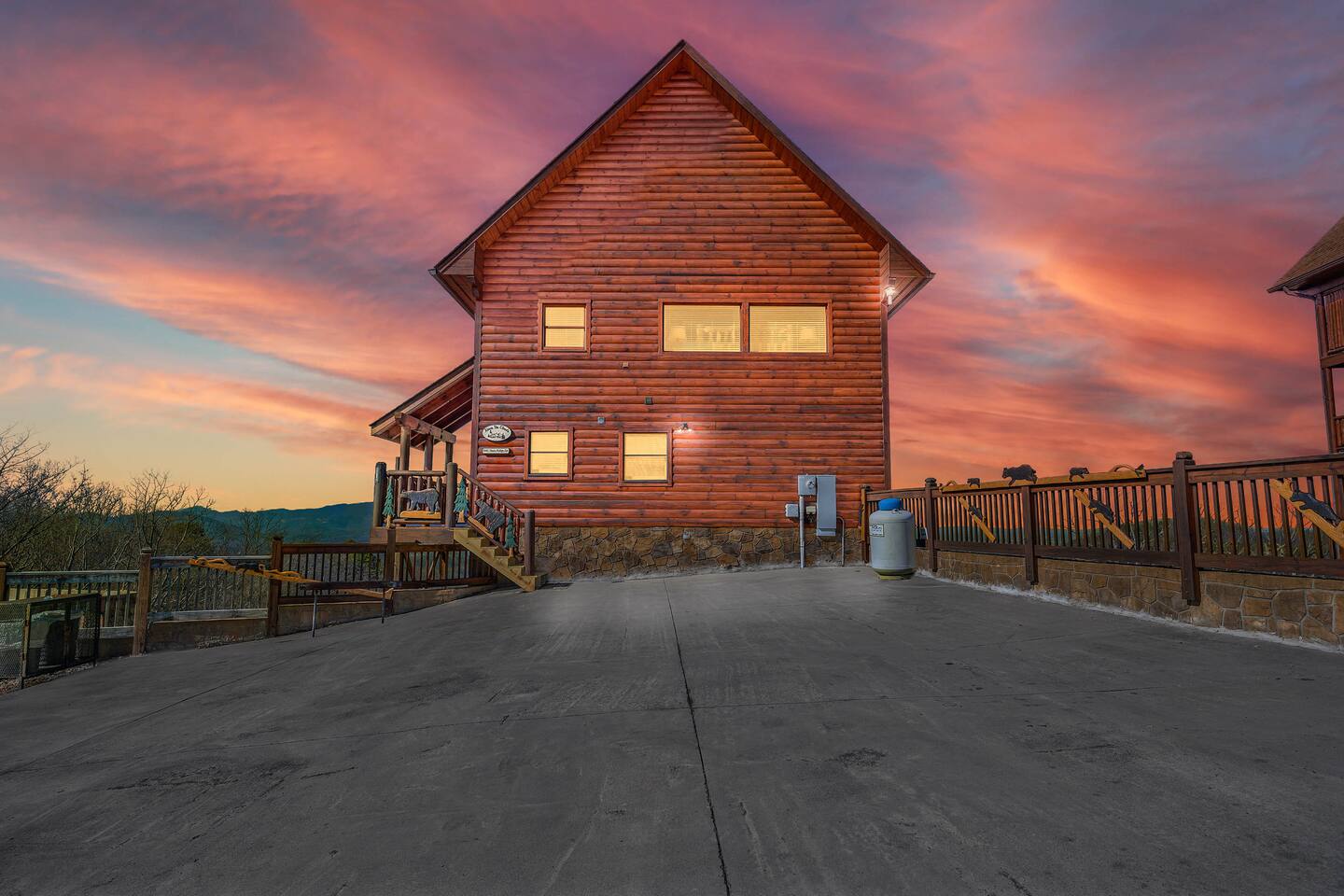 The main level consists of the living area, well equipped kitchen with stainless steel appliances, dining area and one of the master bedrooms and bath. Downstairs you will find 2 additional master bedrooms each with private bath. The downstairs bedrooms are connected with a seating area with a desk for any work/school that may be required. The top floor is where you go to play. Power Putt golf arcade game lets everyone compete at Putt Putt golf without leaving the cabin. Also play on the pool table, 60 game retro arcade and darts. Futon in the loft provides extra sleeping for the kids or kids at heart. This floor also has the other master bedroom with a private fireplace and jacuzzi tub. Step out on the top deck and find the porch swing and hot tub looking over Pigeon Forge. The resort has easy to navigate roads, a pool (during summer season), playground and a picnic area. This cabin also has: *Breathtaking views *Parking for 4 cars *6 Smart TVs *Blazing fast WiFi *Quality linens *Washer/Dryer *Charcoal Grill.