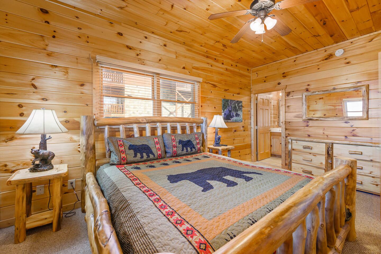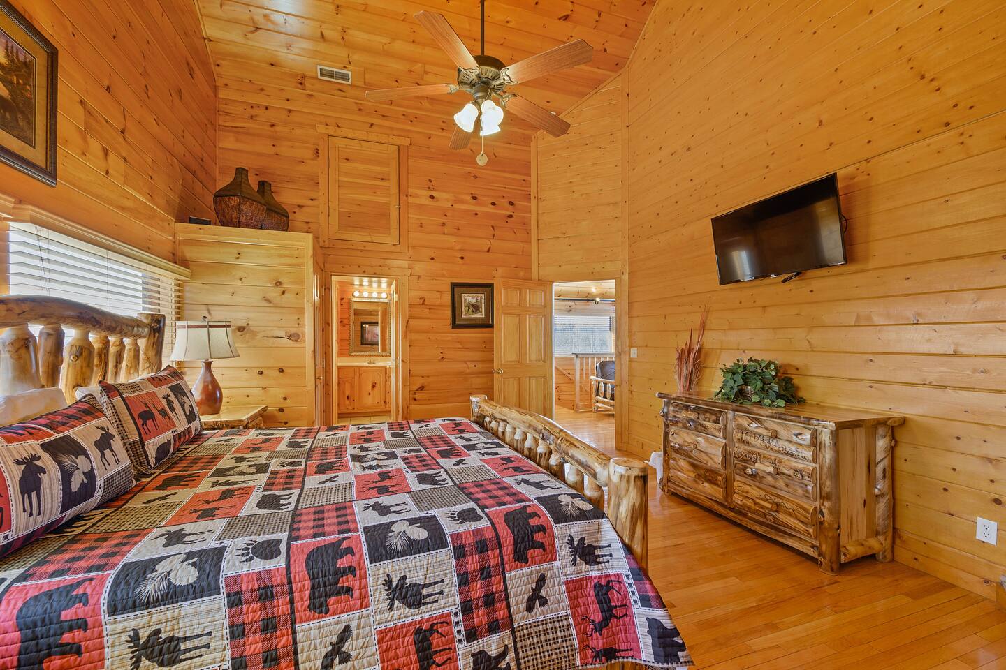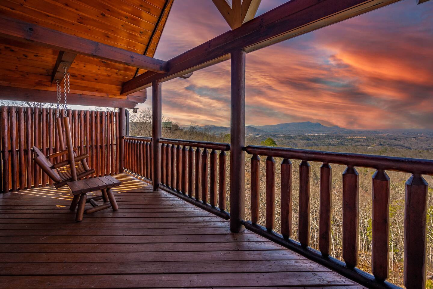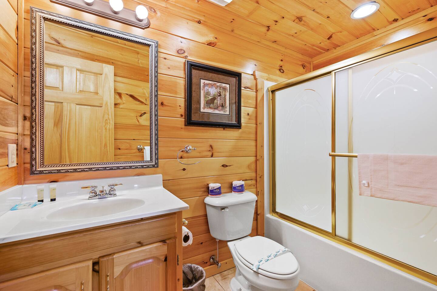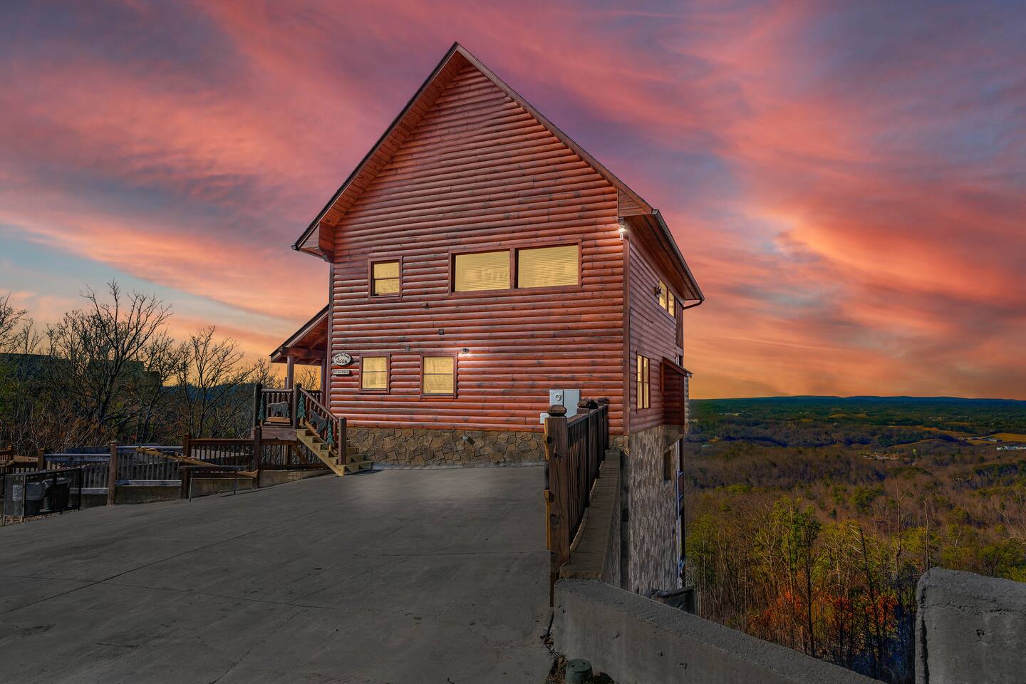 The main level consists of the living area, well equipped kitchen with stainless steel appliances, dining area and one of the master bedrooms and bath. Downstairs you will find 2 additional master bedrooms each with private bath. The downstairs bedrooms are connected with a seating area with a desk for any work/school that may be required. The top floor is where you go to play. Power Putt golf arcade game lets everyone compete at Putt Putt golf without leaving the cabin. Also play on the pool table, 60 game retro arcade and darts. Futon in the loft provides extra sleeping for the kids or kids at heart. This floor also has the other master bedroom with a private fireplace and jacuzzi tub. Step out on the top deck and find the porch swing and hot tub looking over Pigeon Forge. The resort has easy to navigate roads, a pool (during summer season), playground and a picnic area. This cabin also has: *Breathtaking views *Parking for 4 cars *6 Smart TVs *Blazing fast WiFi *Quality linens *Washer/Dryer *Charcoal Grill.