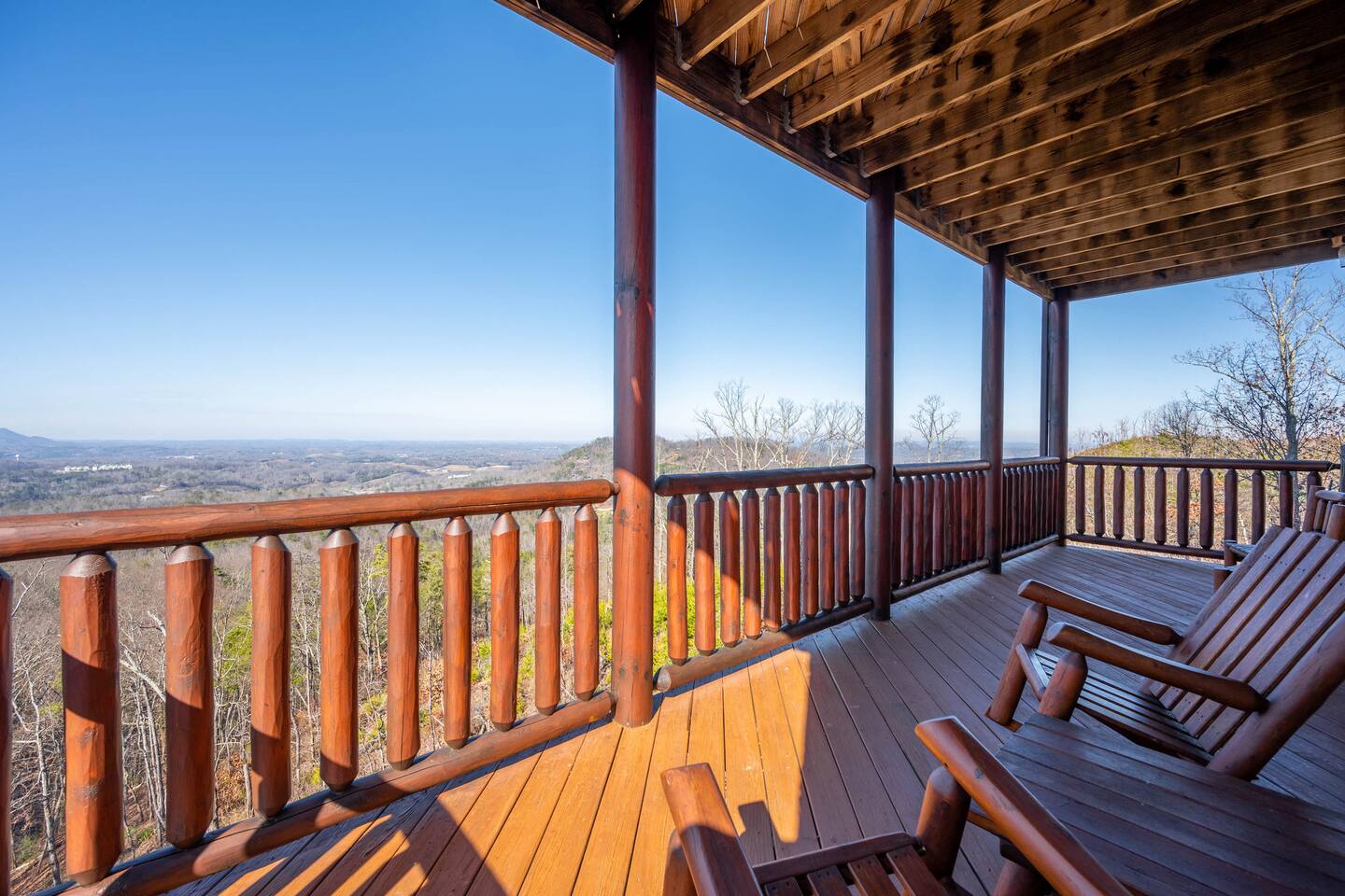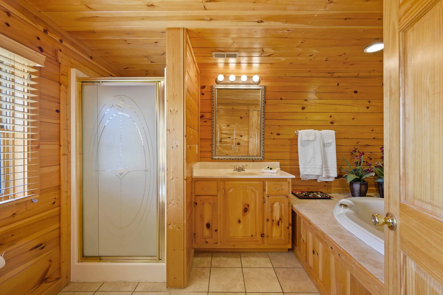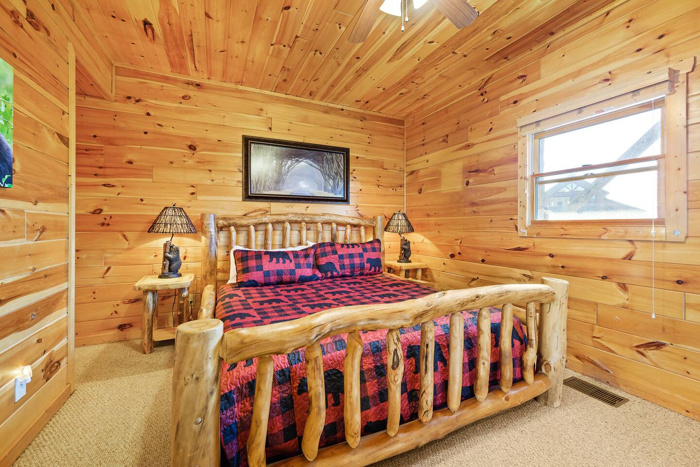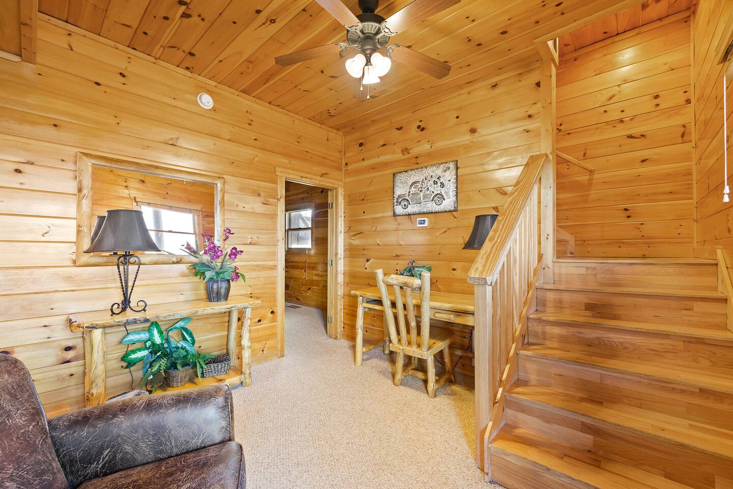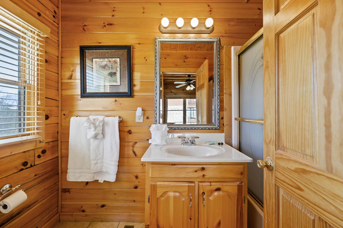 The main level consists of the living area, well equipped kitchen with stainless steel appliances, dining area and one of the master bedrooms and bath. Downstairs you will find 2 additional master bedrooms each with private bath. The downstairs bedrooms are connected with a seating area with a desk for any work/school that may be required. The top floor is where you go to play. Power Putt golf arcade game lets everyone compete at Putt Putt golf without leaving the cabin. Also play on the pool table, 60 game retro arcade and darts. Futon in the loft provides extra sleeping for the kids or kids at heart. This floor also has the other master bedroom with a private fireplace and jacuzzi tub. Step out on the top deck and find the porch swing and hot tub looking over Pigeon Forge. The resort has easy to navigate roads, a pool (during summer season), playground and a picnic area. This cabin also has: *Breathtaking views *Parking for 4 cars *6 Smart TVs *Blazing fast WiFi *Quality linens *Washer/Dryer *Charcoal Grill.