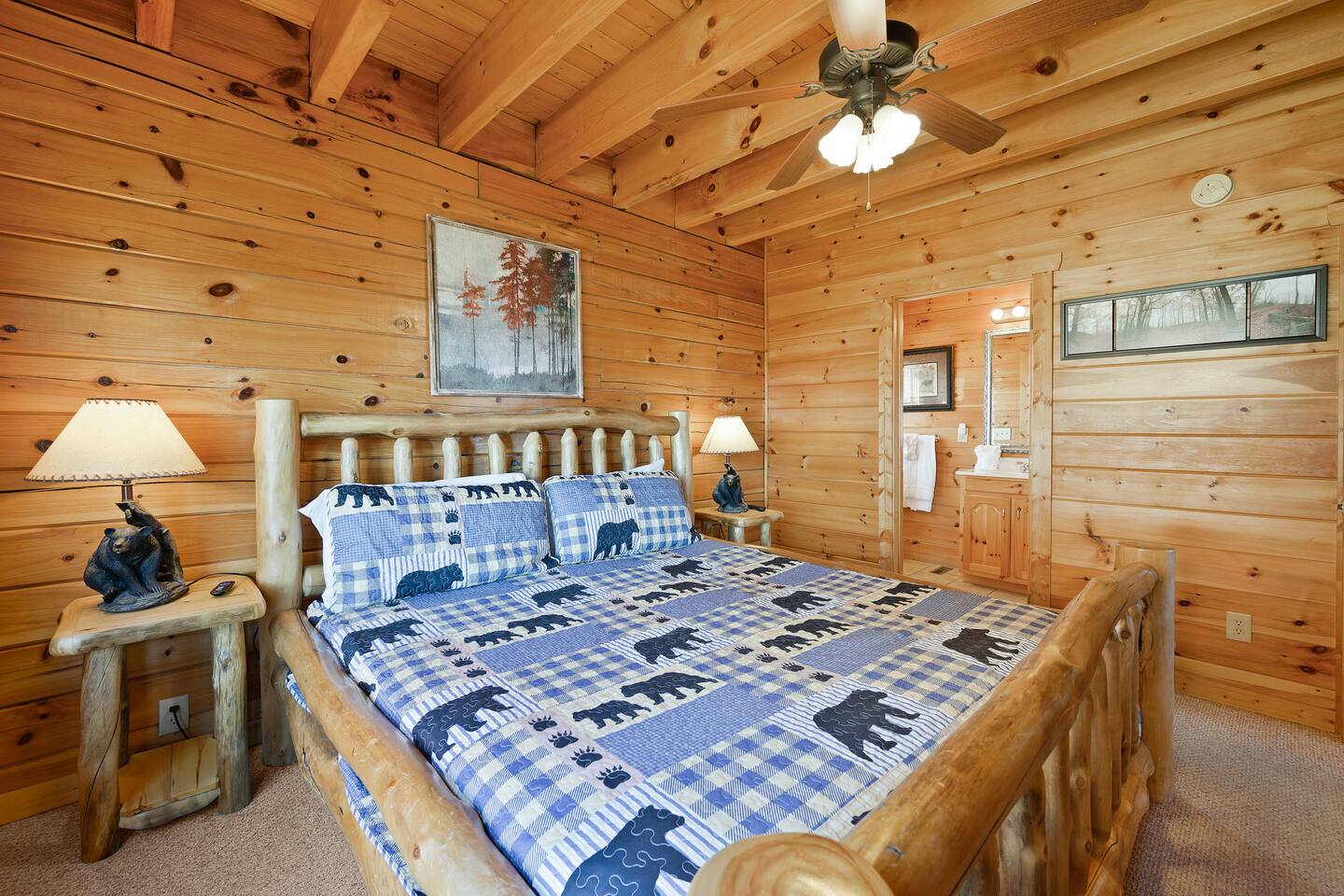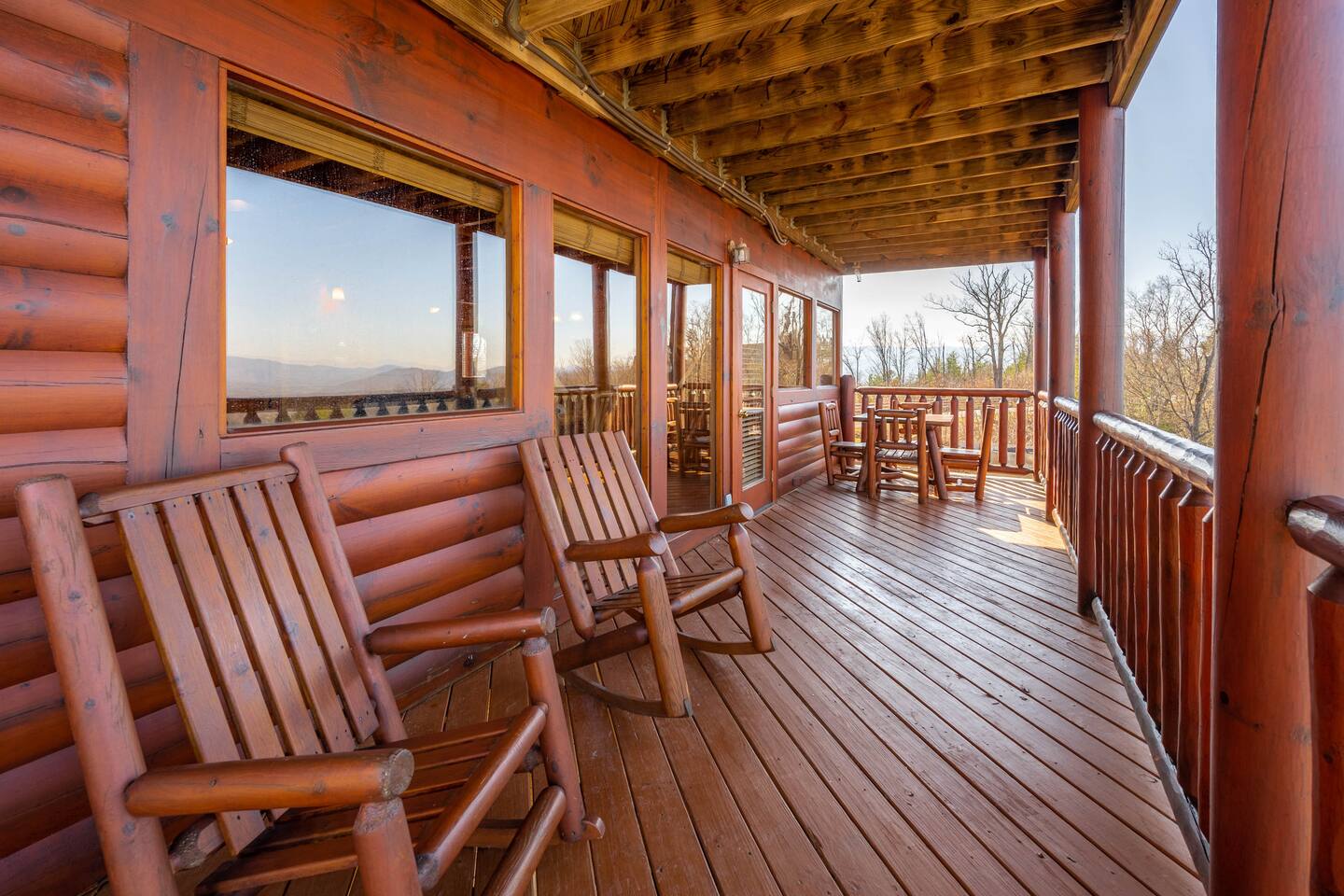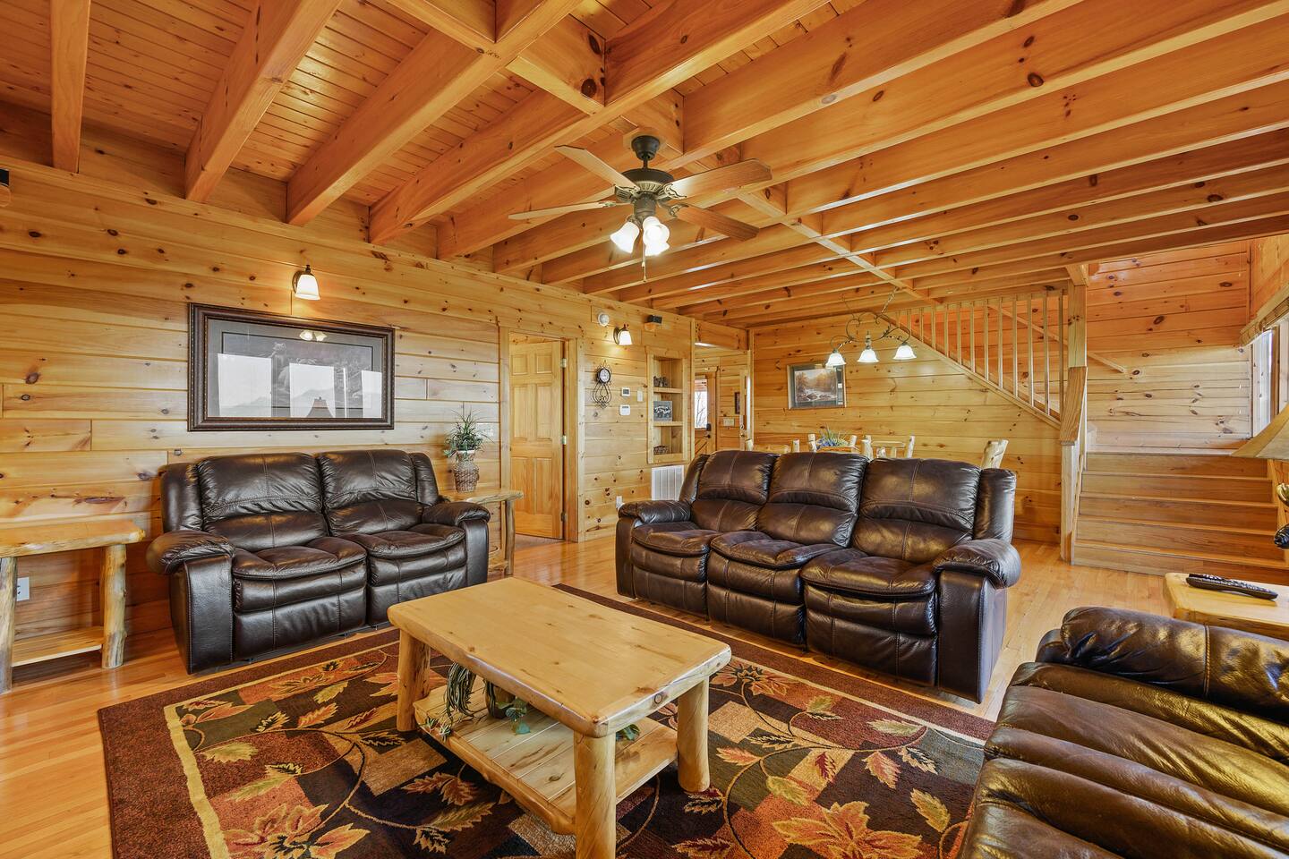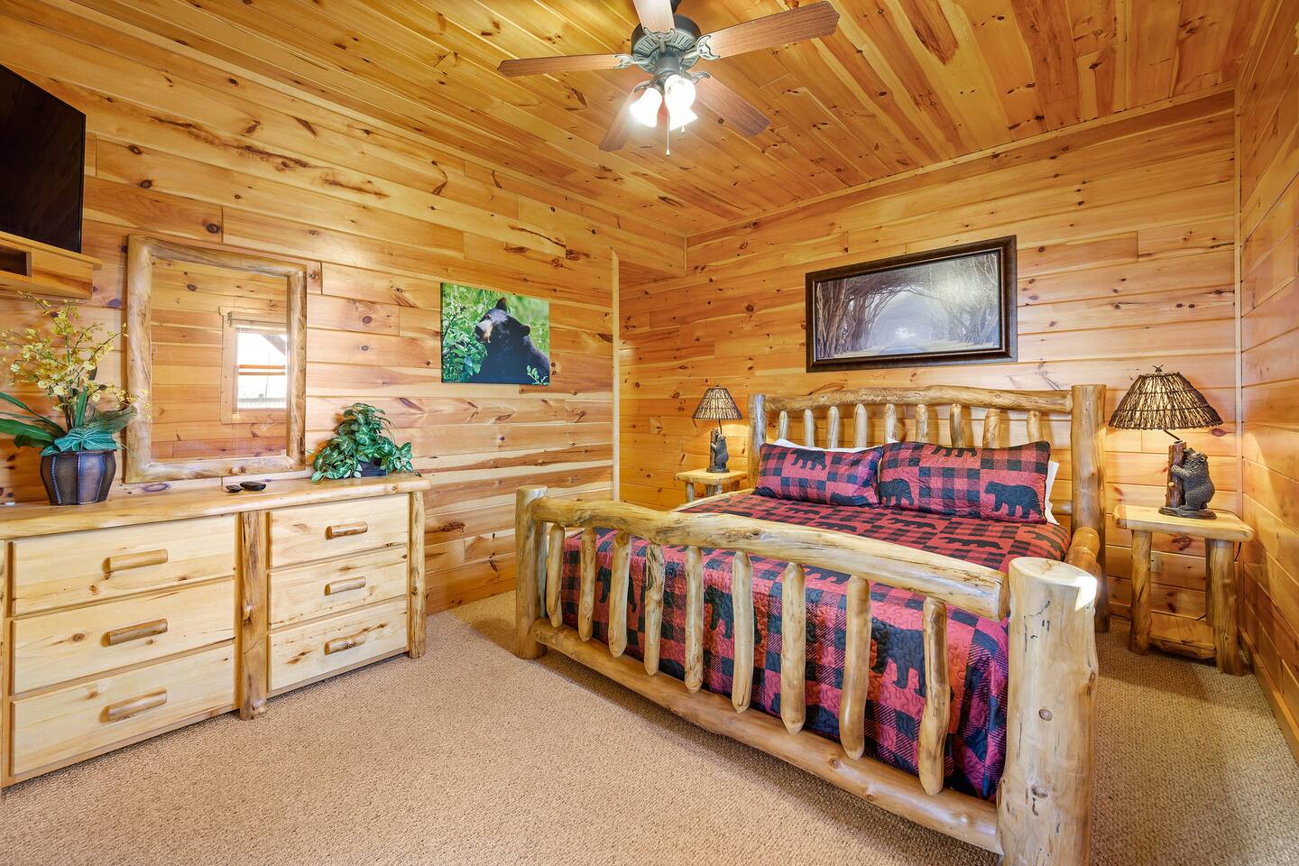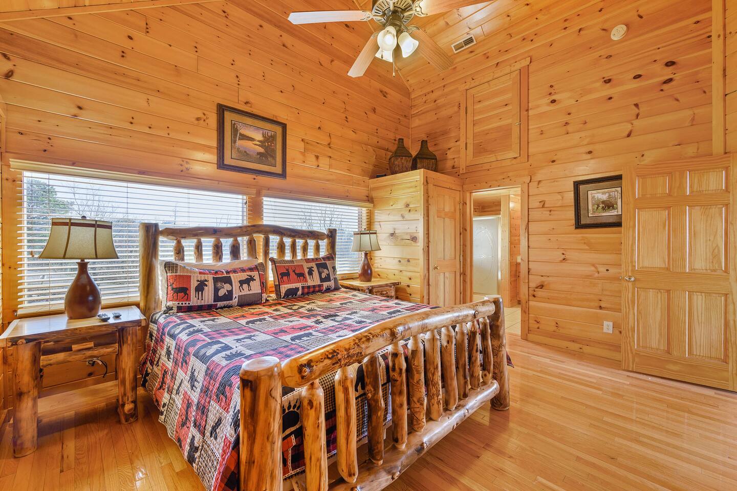 The main level consists of the living area, well equipped kitchen with stainless steel appliances, dining area and one of the master bedrooms and bath. Downstairs you will find 2 additional master bedrooms each with private bath. The downstairs bedrooms are connected with a seating area with a desk for any work/school that may be required. The top floor is where you go to play. Power Putt golf arcade game lets everyone compete at Putt Putt golf without leaving the cabin. Also play on the pool table, 60 game retro arcade and darts. Futon in the loft provides extra sleeping for the kids or kids at heart. This floor also has the other master bedroom with a private fireplace and jacuzzi tub. Step out on the top deck and find the porch swing and hot tub looking over Pigeon Forge. The resort has easy to navigate roads, a pool (during summer season), playground and a picnic area. This cabin also has: *Breathtaking views *Parking for 4 cars *6 Smart TVs *Blazing fast WiFi *Quality linens *Washer/Dryer *Charcoal Grill.